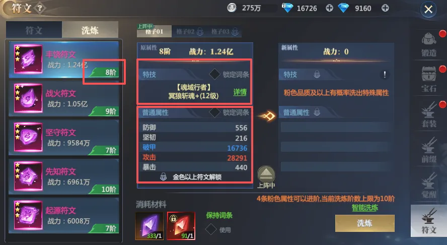 洗练的顺序是:先洗阶数,把阶数提起来,特技和属性才会更强,再洗特技,找到自己职业分支的特技并且是10级以上,最后就是锁定特技慢洗属性,这样会节省很多【符文锁定石】