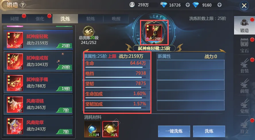 首先是装备洗练,装备洗练需要3条红色属性才可以进阶,我们可以先存精华,当我们有第一件粉装的时候再去洗练,粉装拥有5条属性,自然可以更快的获取红色属性完成进阶