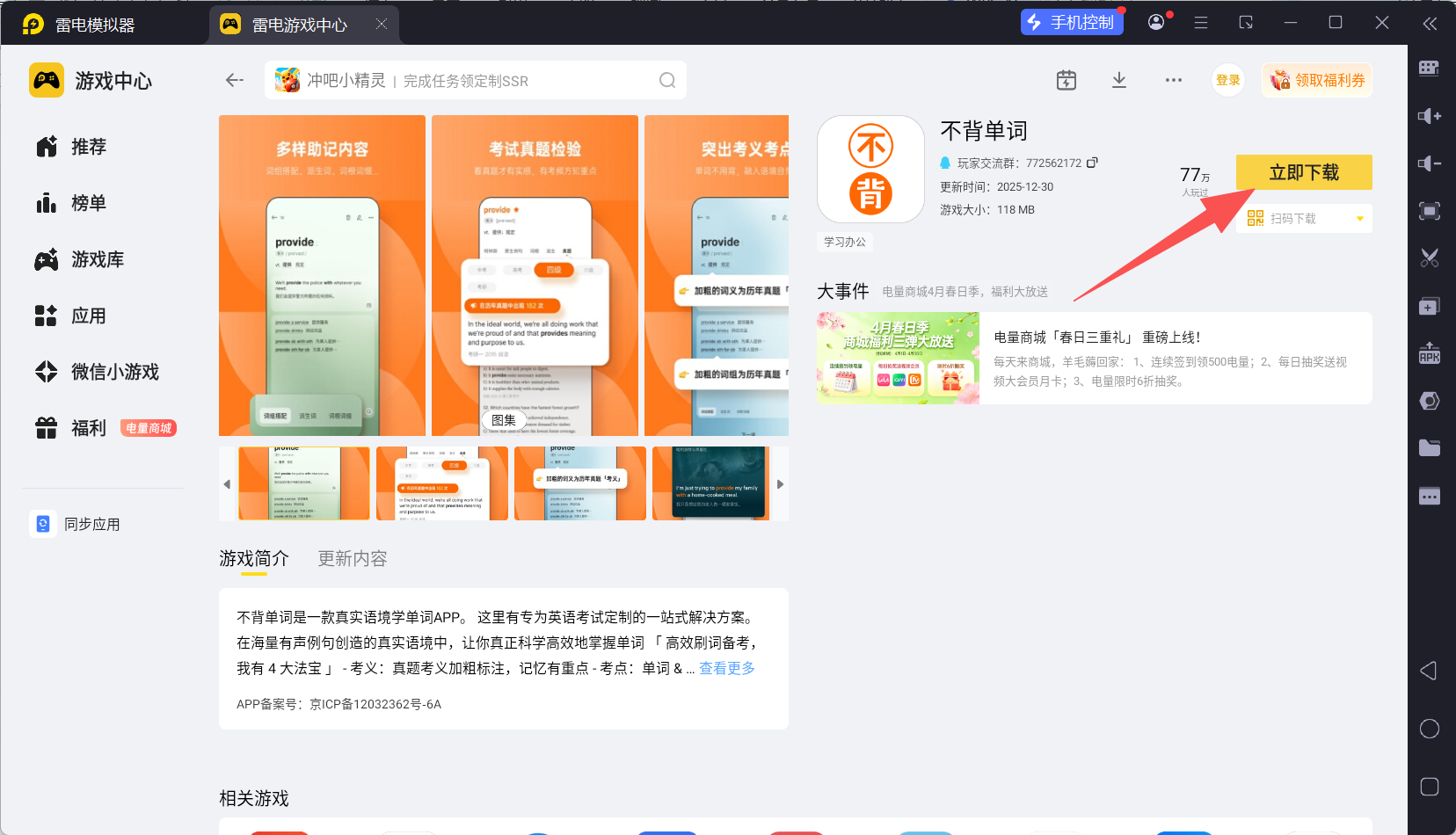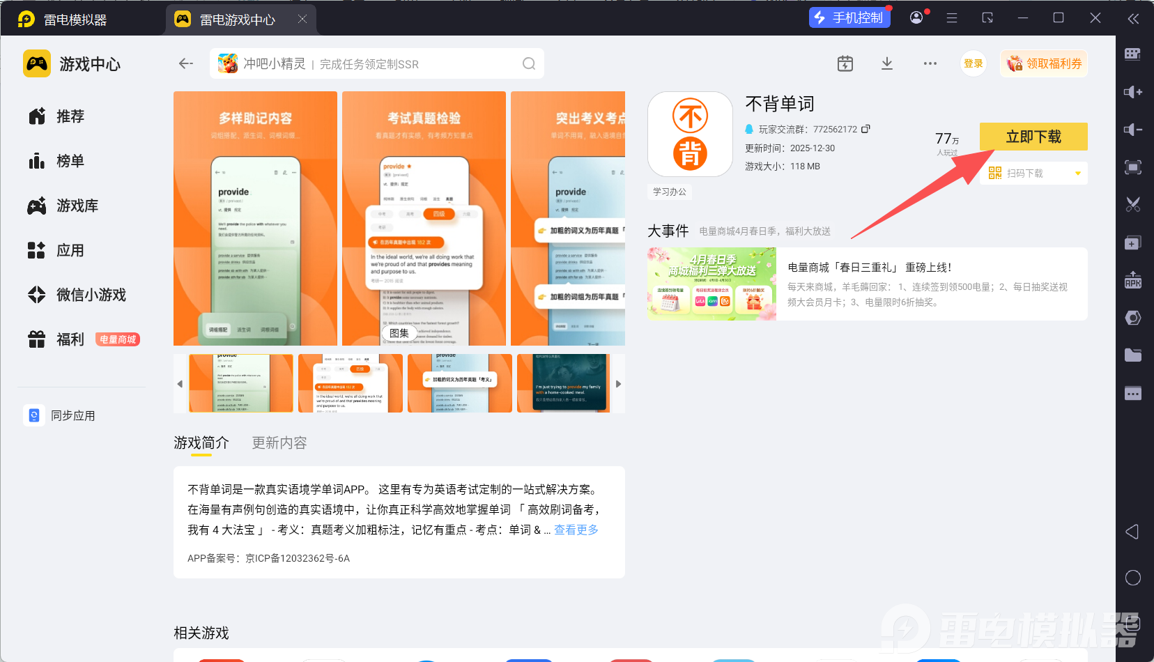 不背单词电脑版能够让英语学习环境更加舒适,大屏阅读例句更清晰,键盘拼写练习也更加高效。如果你正在寻找稳定的不背单词电脑版下载方式,推荐雷电模拟器。