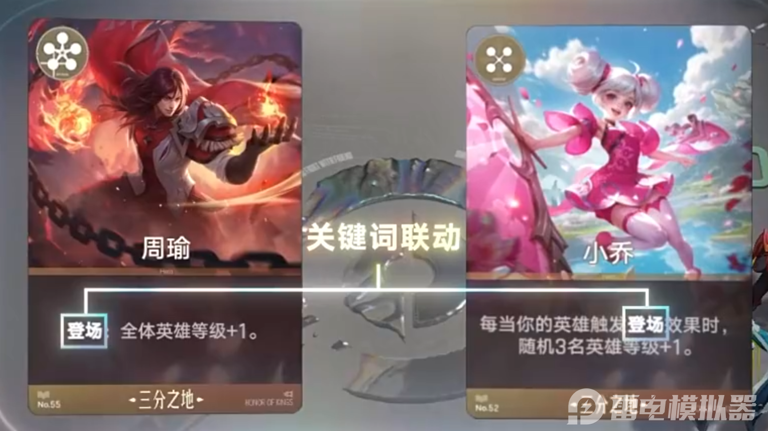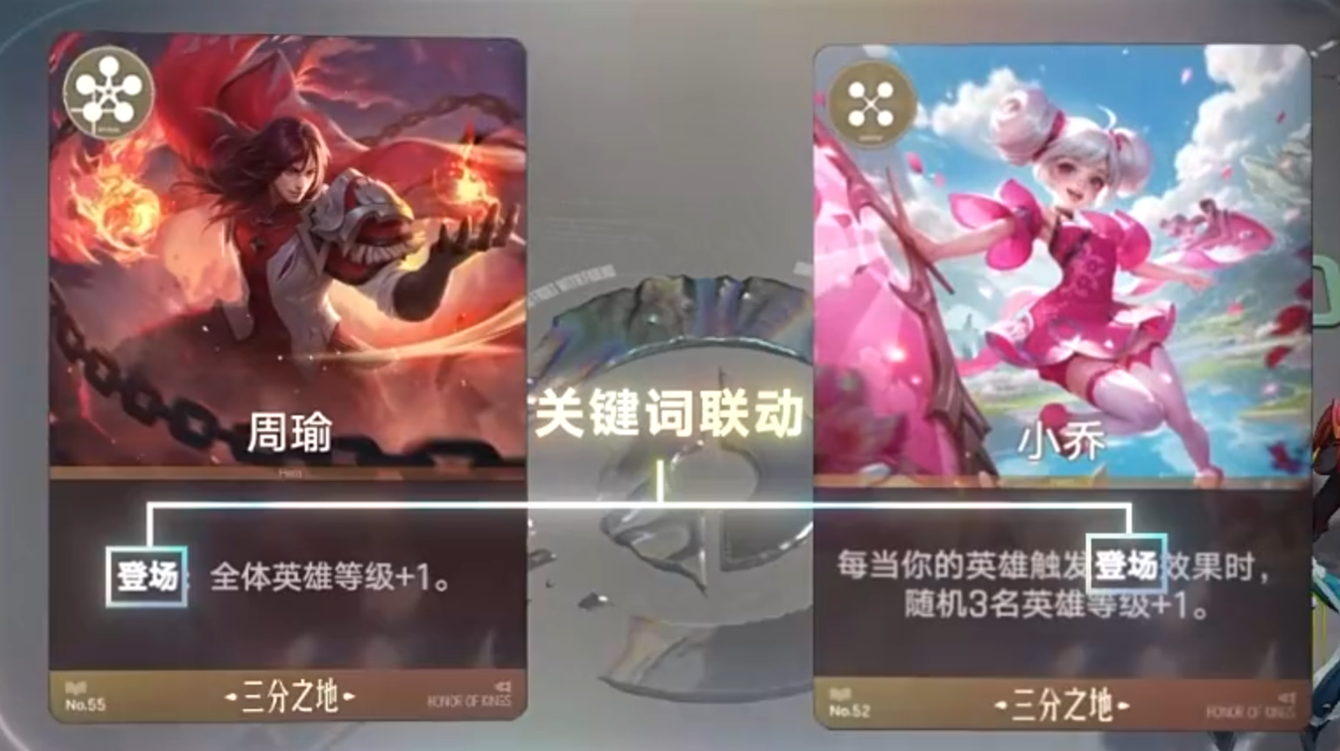 阵容构建逻辑是胜利的关键,英雄都有自己所属的阵营及关键词,凑齐阵营羁绊不是最优解,而是将英雄之间的关键词进行联动,才是提升对局战力的关键。像周瑜登场时会触发自身关键词效果(全体英雄等级+1),再与小乔的关键词产生卡牌联动,进一步提升场上英雄等级。要注意的是英雄上场后不可撤回,需要集齐4张相同英雄卡牌触发觉醒机制,才能回收手牌重新调整。