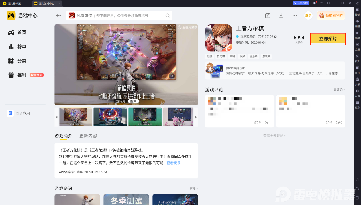 王者万象棋是一款策略对战手游,采用时尚现代且活泼个性的美术风格,构建了一个王者平行世界,玩家将化身棋手,在对战中召唤来自不同时间、空间的王者英雄,赢取胜利的荣耀。想知道王者万象棋预约地址在哪?现在就为大家带来王者万象棋预约方式,赶紧来雷电模拟器预约,开启轻松畅玩之旅。