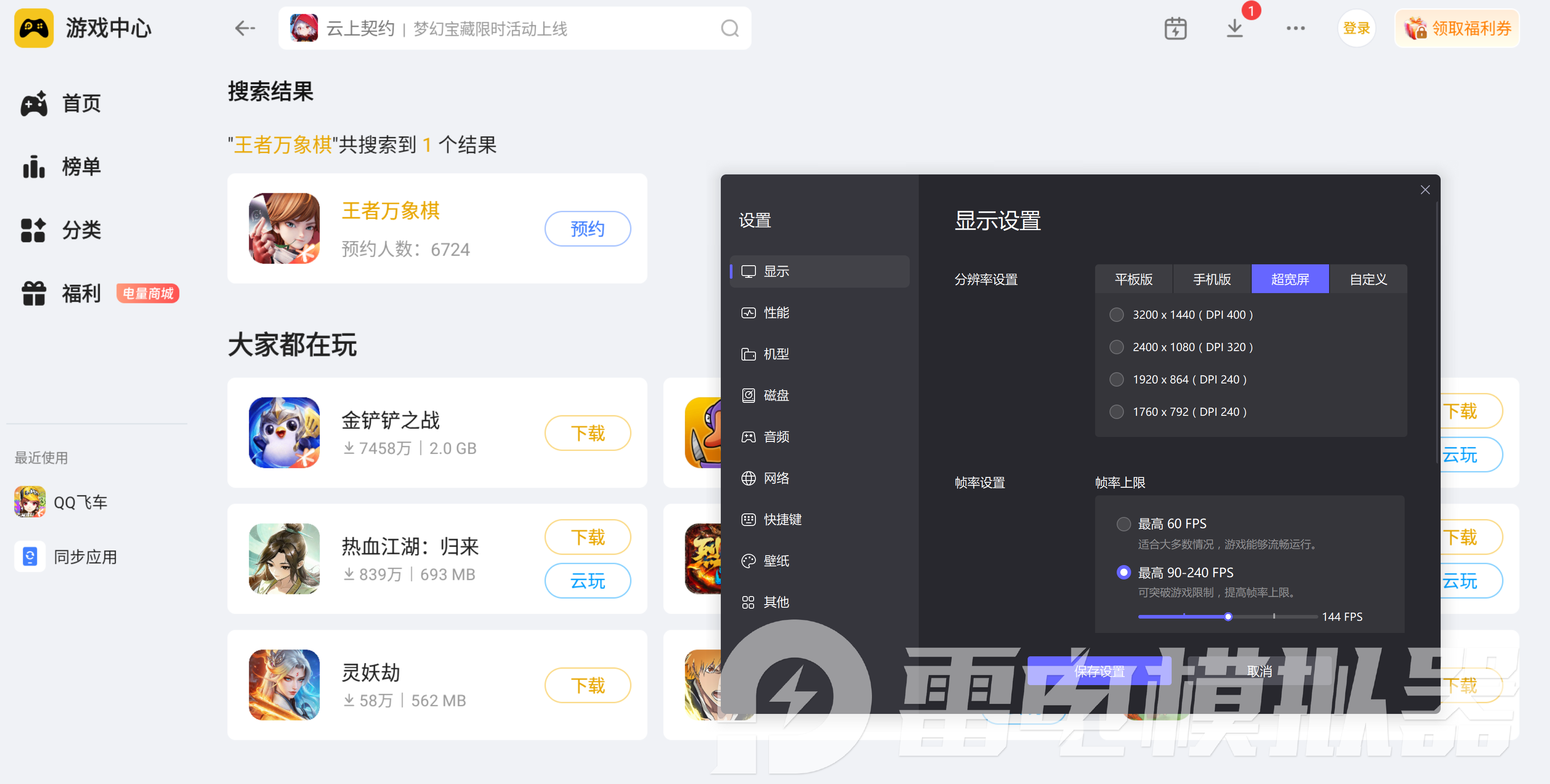 任何一个王者万象棋的玩家,都希望拥有高清大屏的体验效果。此时,雷电模拟器的超宽屏技术,大屏高分辨率,就显得尤为重要了,因为它能让我们完美的享受到更清晰、更醒目的河洛战斗画面,增强王者万象棋游戏体验感。