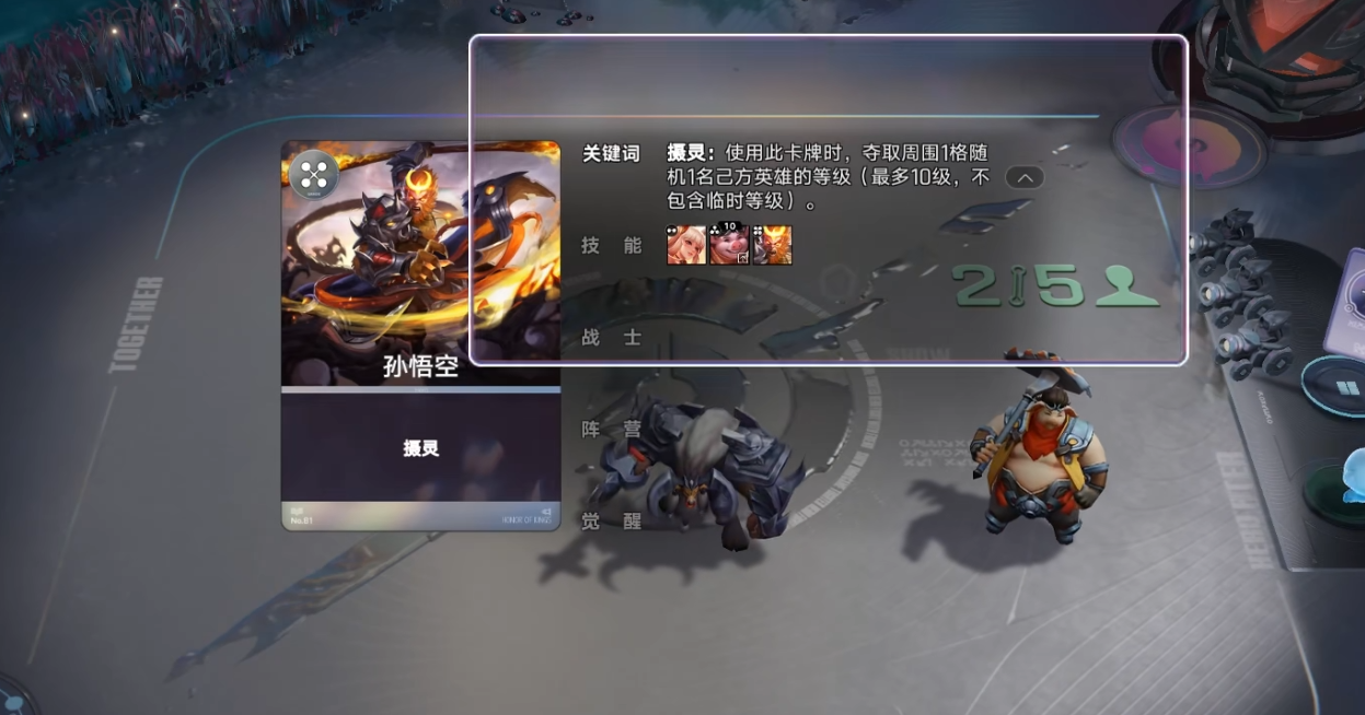 棋子放到场上时,会吸取周围一格内任意英雄的等级(最高十级)。孙悟空、猪八戒等都有这个关键词,也能用“摄灵之术”效果牌触发。