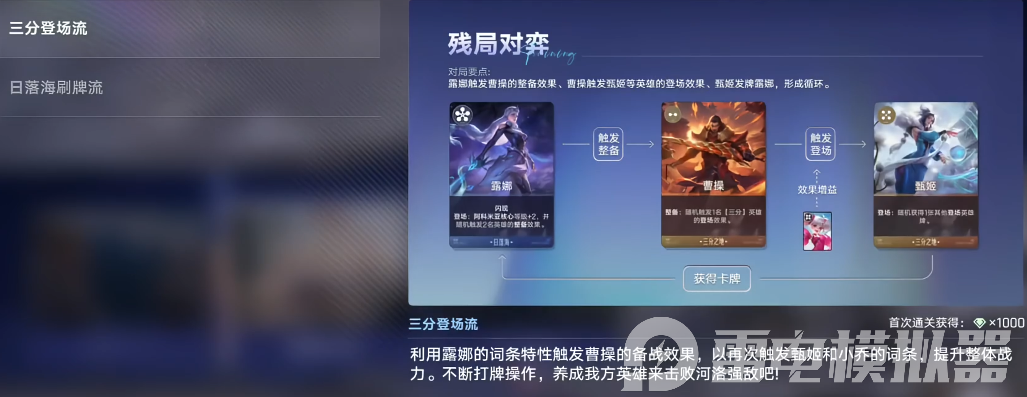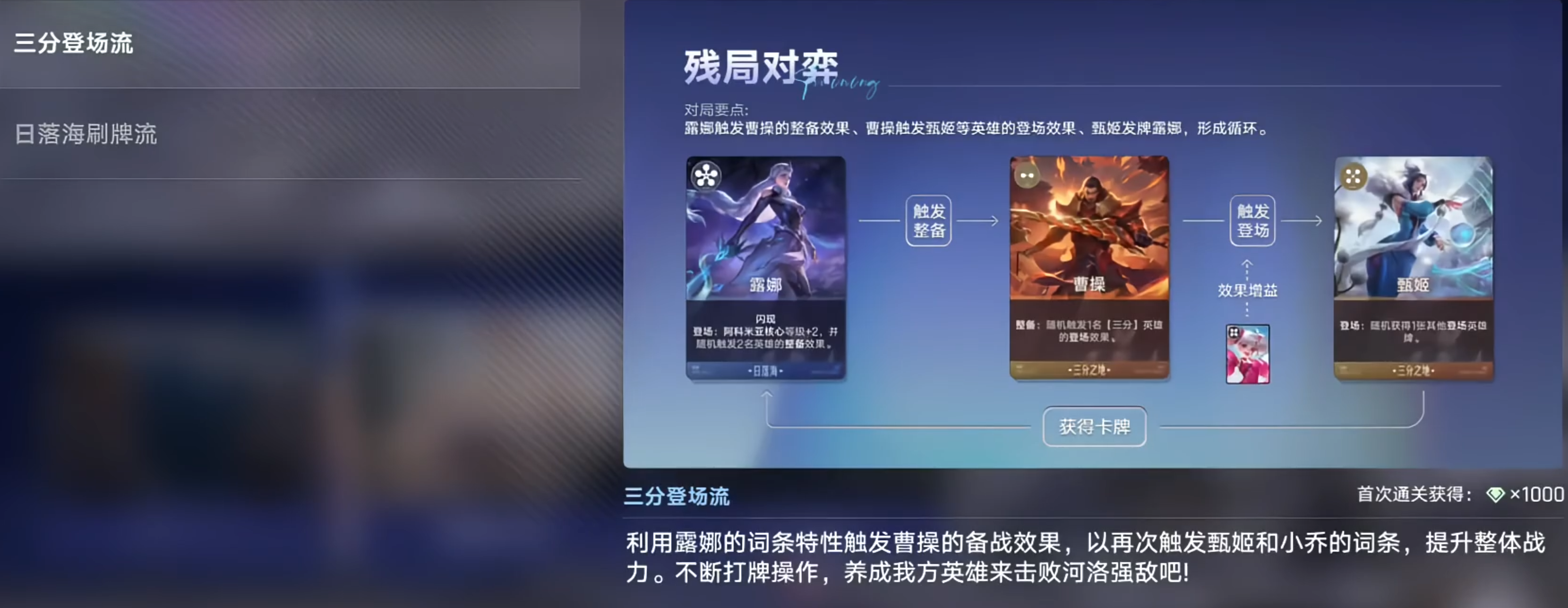 通关思路:核心是觉醒甄姬、觉醒曹操,再用露娜刷新曹操整备,觉醒周瑜后搭配吕布开大秒杀。登场牌顺序优先蒙犽、貂蝉、阿珂和赵云。第一回合务必觉醒甄姬、曹操,没遇到就退出重开;第二回合曹操觉醒后,刷新露娜过程中给周瑜觉醒,通过登场效果提升等级再卖掉刷新露娜;第三回合选吕布主C,海月困怪,有条件选个太乙复活。锦囊优先性三分大于日落海、求贤。