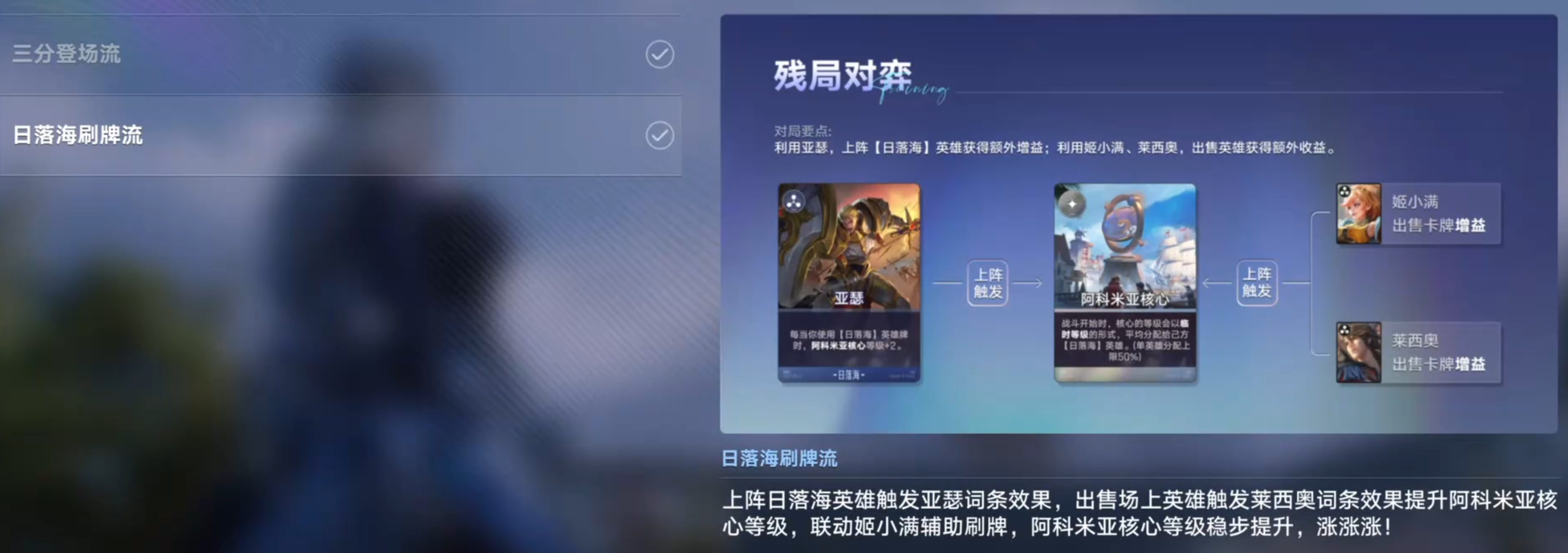 通关思路:核心英雄姬小满、莱西奥、亚瑟和海诺都要觉醒。头两个回合刷姬小满、亚瑟、莱西奥和海诺到觉醒;第三回合刷姜子牙,使用不在场的阵营级无阵营的英雄牌时,姜子牙和随机3名其他阵营的英雄等级+1。锦囊优先日落海、4阶英雄、求贤或两张传承提升核心等级。