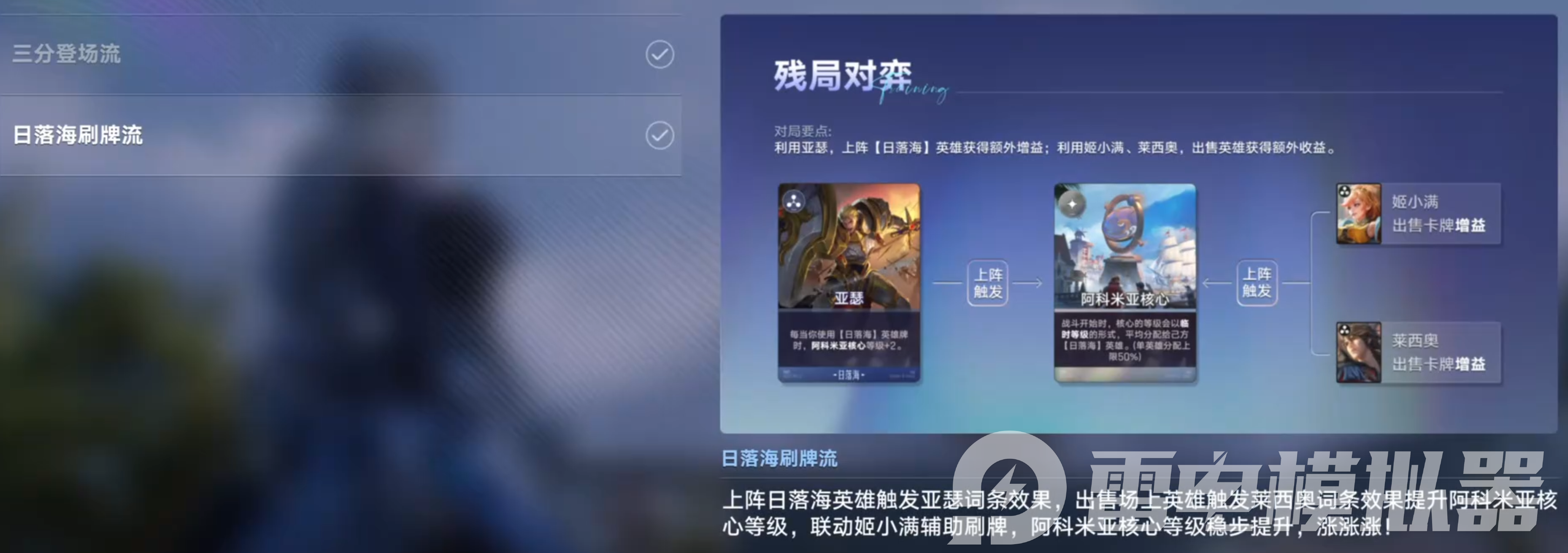 在残局对弈时,要综合考虑英雄的觉醒、站位、登场牌顺序以及锦囊的选择等因素,不断根据敌方的阵容和布局做出调整,才能取得胜利。推荐使用雷电模拟器进行游戏,让操作更为便捷,并且电脑端的视野和操作空间更大,能帮助玩家更清晰地观察局势和排兵布阵。