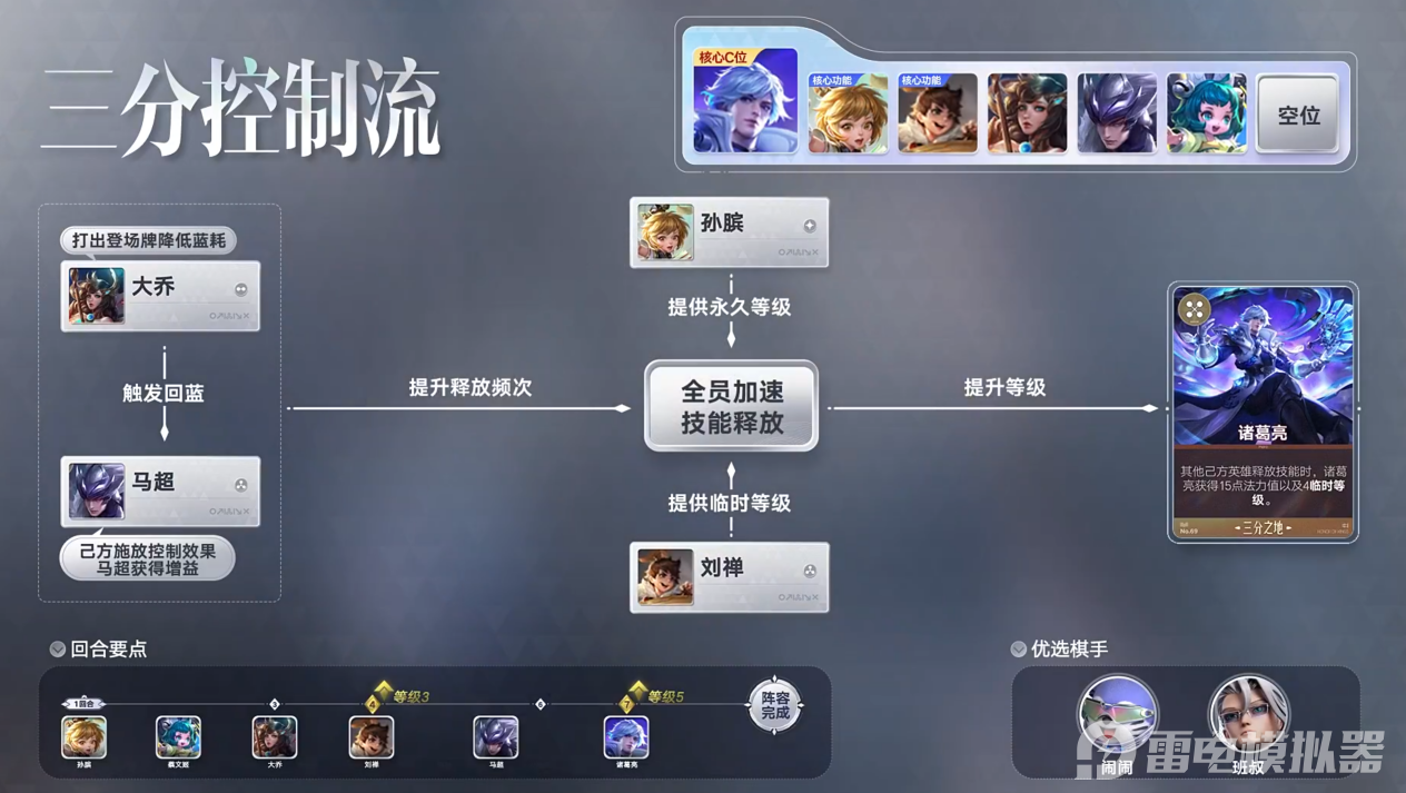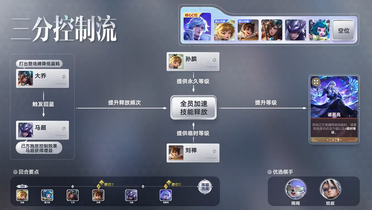 三分控制流:以大乔、刘禅释放技能提供控制效果为核心,马超和诸葛亮作为关键输出,依靠队友释放技能或是施加控制效果获得法力值,从而频繁释放技能;技能释放期间,刘禅可为释放技能的英雄提供临时等级,蔡文姬不仅为全队提供治疗,其关键词效果在使用“三分”英雄牌时为团队提供等级提升;后期还可以补充周瑜、吕布或明世隐进一步提高战斗力。