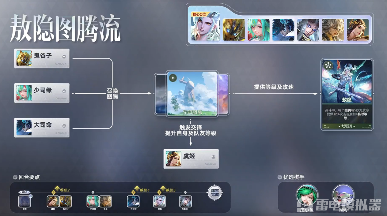 大河图腾敖隐流:鬼谷子、大司命和少司缘均可召唤出对应图腾,虞姬、张良与东皇太一构成等级成长的加速器。虞姬依据场上图腾数量,稳定提升阵容等级;东皇则能获得图腾带来的临时等级,二者交锋时会联动触发张良的效果,实现单回合多次升级,迅速拉起阵容节奏。到后期核心英雄敖隐的强度与图腾数量直接挂钩,图腾越多获得的攻速和临时等级越高,配合高等级后技能回复能力,直接站桩清场。