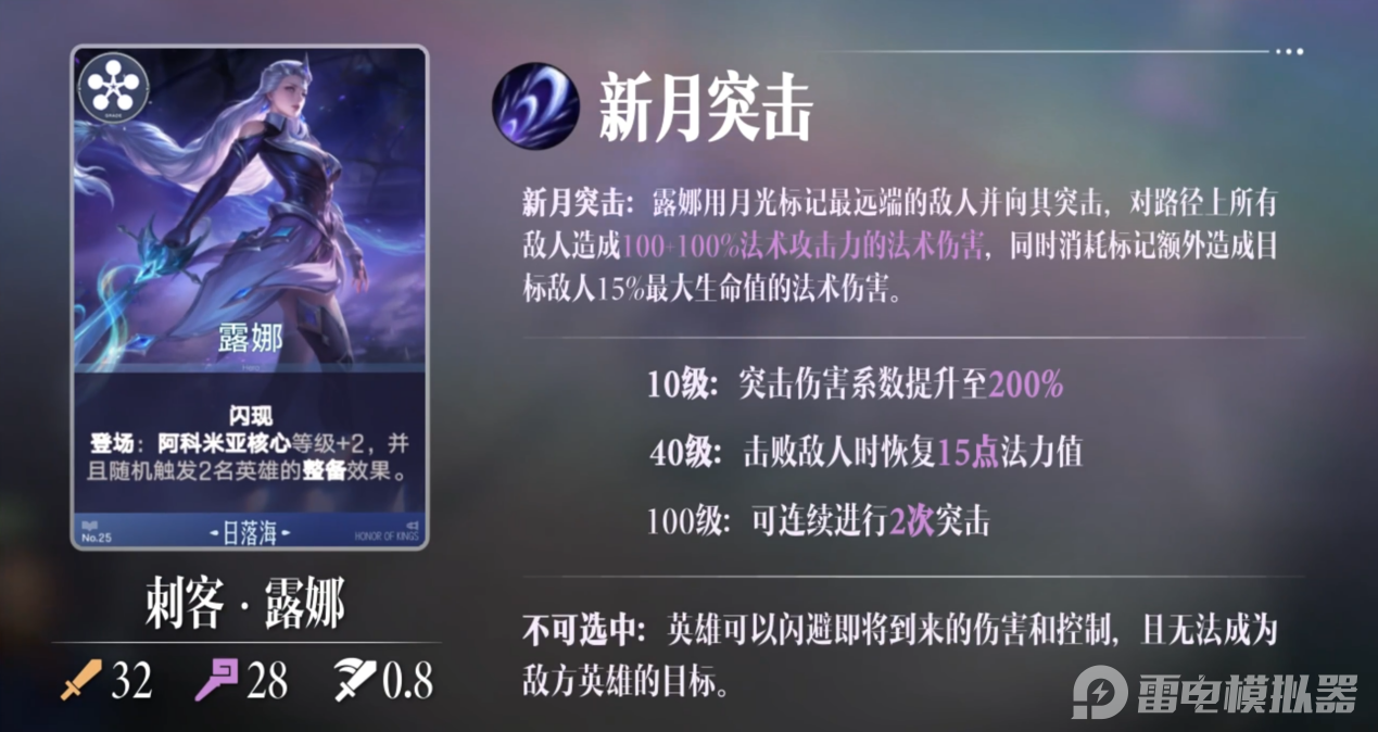 技能新月突击:露娜用月光标记最远端的敌人并向其突击,对路径上所有敌人造成100+100%法术攻击力的法术伤害,同时消耗标记额外造成目标敌人15%最大生命值的法术伤害。