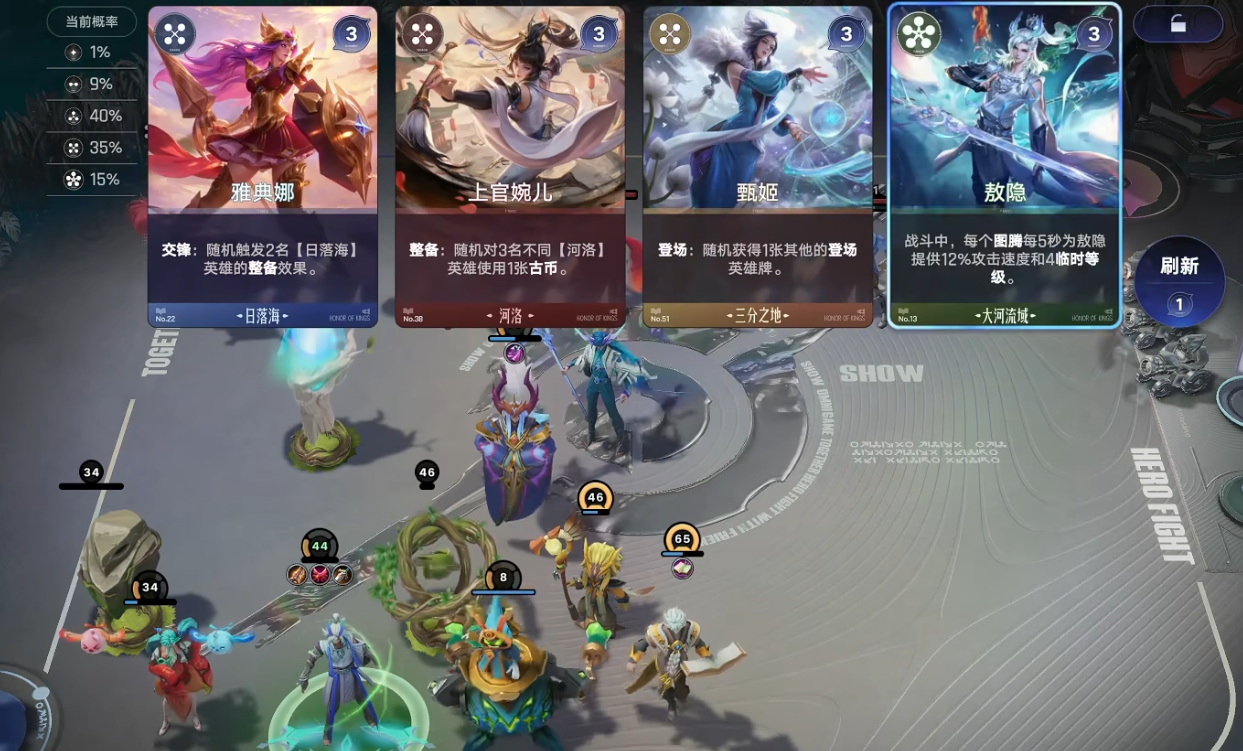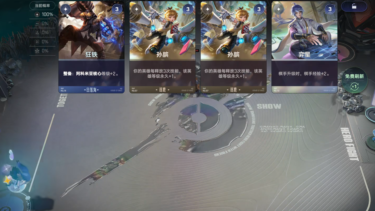 前期(1-4回合):优先用奕星、狂铁等过渡卡稳血线,不浪费能量刷新,重点提升棋手等级,第4回合前升到3级,方便搜出虞姬和鬼谷子。没有虞姬的话,可用干将莫邪临时替代,同时预留敖隐的装备给虞姬过渡。