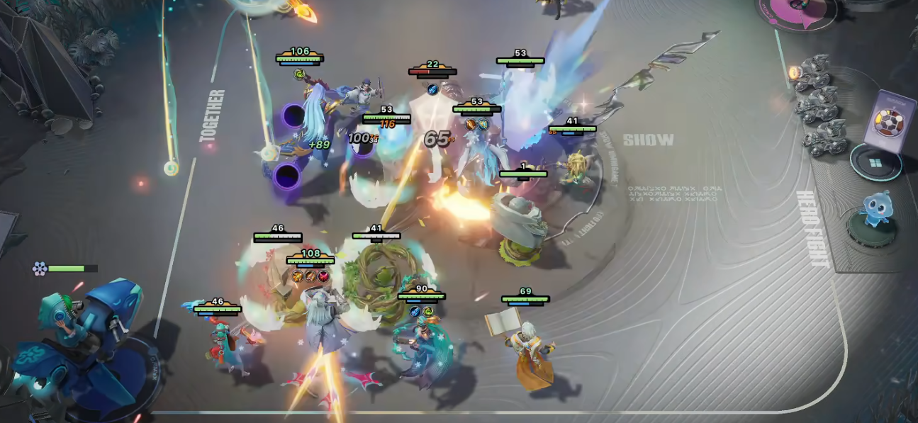 中期(5-6回合):第6回合血量健康就升到4级,补入少司缘和张良,搭建好阵容骨架。第二次竞拍结束后升至5级,补齐剩余英雄,此时敖隐入场,阵容正式成型。