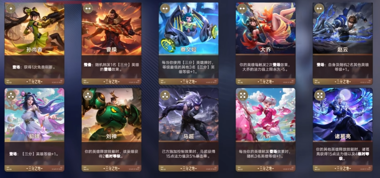 三分之地羁绊围绕“登场”“准备”机制展开,核心英雄包括曹操、赵云、周瑜、貂蝉等。上阵2名该阵营英雄即可激活基础效果,队友登场时概率获得等级+1;上阵4名时,准备阶段额外触发“等级跃迁”,核心输出英雄(如周瑜)可快速解锁高级技能。搭配思路偏向中后期发力,前期用低费英雄过渡,后期补入貂蝉、赵云,利用登场联动让全队等级快速成型,适合持久作战。