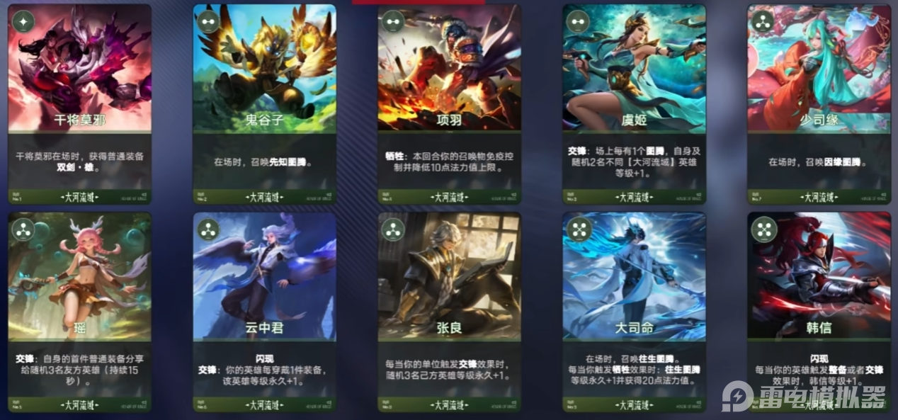 大河流域羁绊无需过牌,核心机制是“图腾召唤”与“交锋升级”,核心英雄有东皇太一、敖隐、鬼谷子、虞姬。上阵3名即可激活,鬼谷子、大司命等英雄能召唤图腾,虞姬可根据图腾数量为全队提升等级;上阵5名时,敖隐登场后将获得所有图腾的属性加成,攻速与生存能力大幅提升,且开战自动触发“交锋”特性,快速升级成型。前期压制力强,适合喜欢速战速决的玩家。