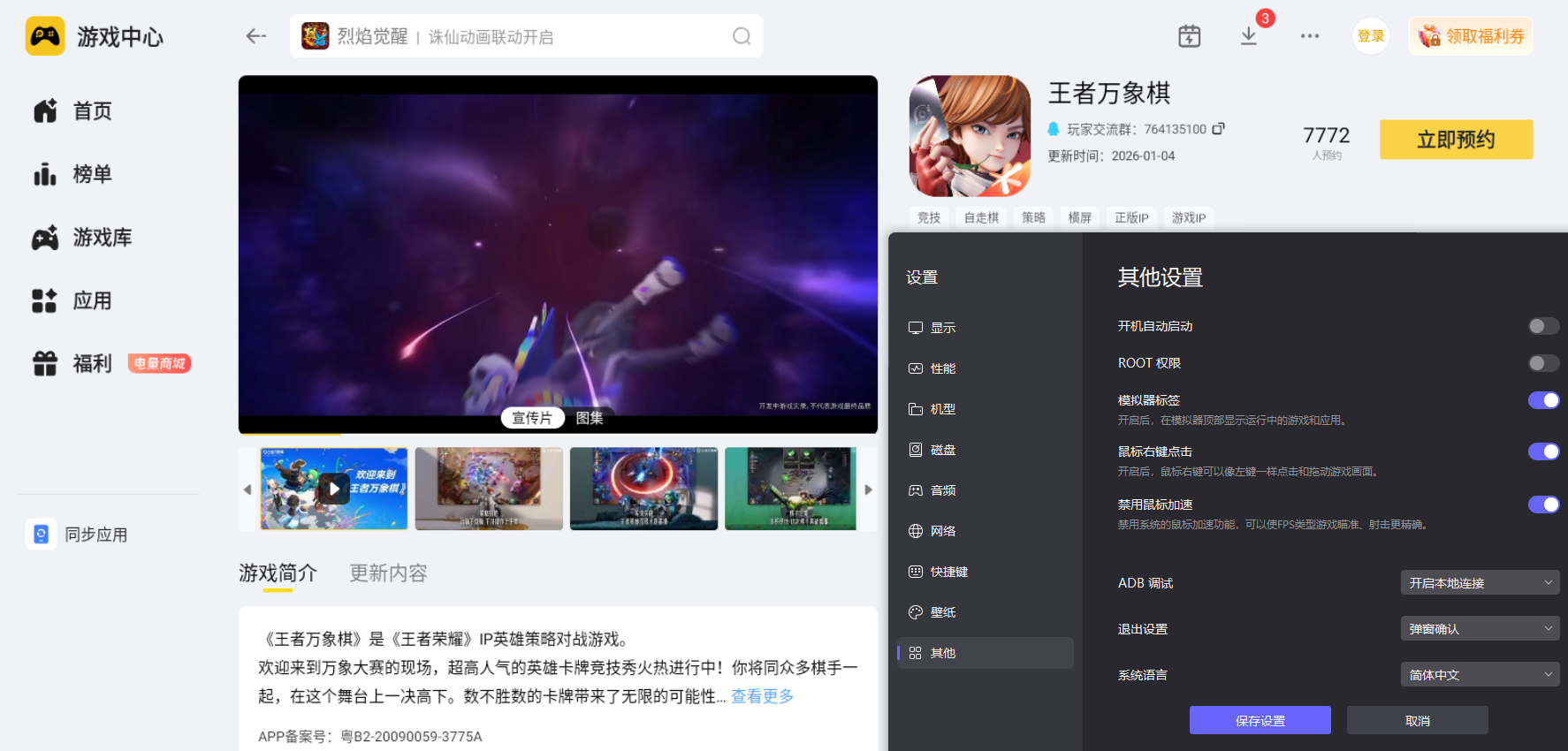 选对下载安装工具,能让《王者万象棋》的游玩体验更贴合需求,雷电模拟器是适配这款游戏的优质选择,它里面的功能贴合游戏策略操作、多阵容练习的特点,为玩家带来专属的游玩优势,让下载安装后的游戏体验更顺手,轻松感受策略棋战的魅力。
