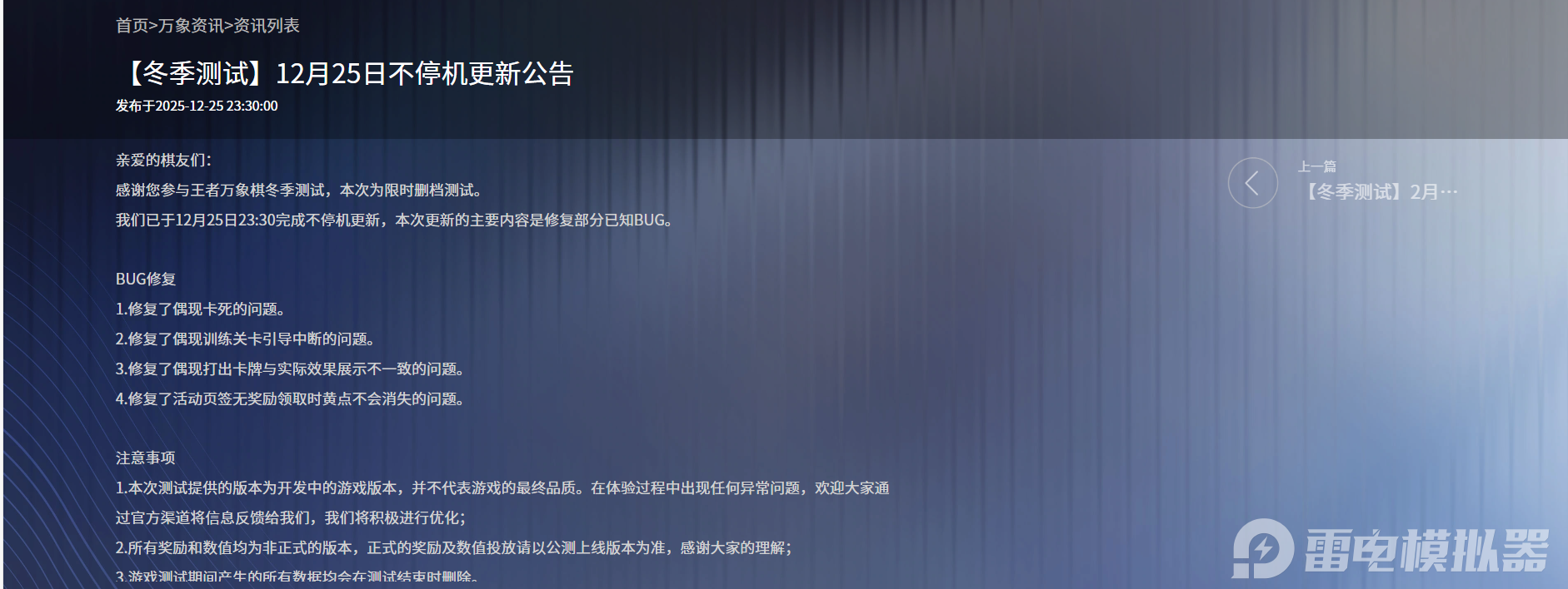 雷电模拟器的高清大屏优势十分突出,能将游戏中的棋盘布局、英雄细节、公告提示等清晰呈现,轻松查看测试公告、了解发布时间,实操对局,信息获取更高效,也能更清晰看清每一步操作细节。