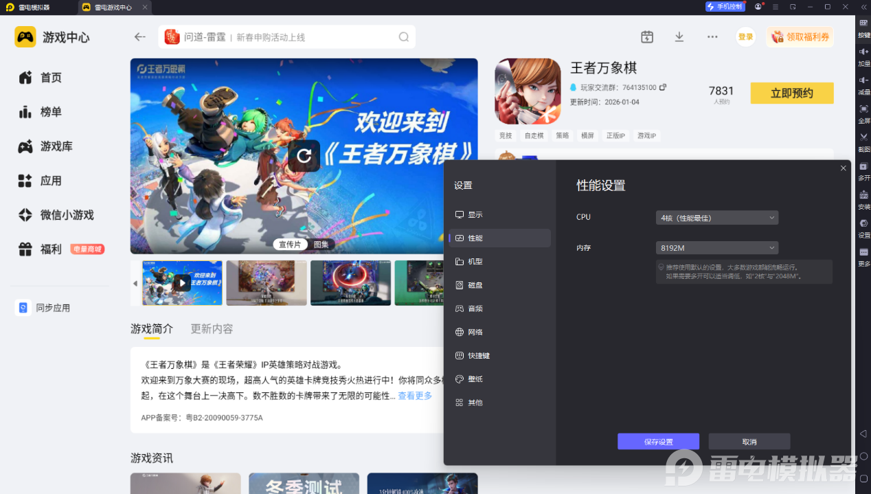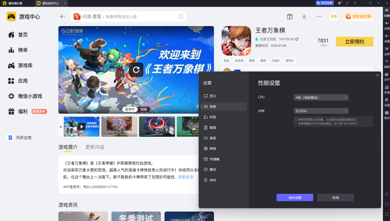 王者万象棋什么时候能玩?推荐到雷电模拟器预约该游戏,正式上线第一时间就会有提醒。雷电模拟器也能全程陪伴玩家,稳定性能、清晰大屏显示,帮你能拥有更舒适、更顺畅的对局体验。
