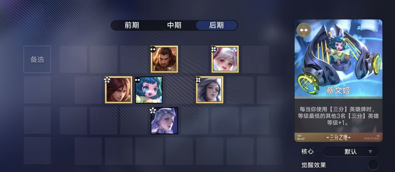 该流派主打快攻连胜。1-3回合严控经济,仅留目标牌并优先升弈星与2级马可,拍卖抢拿曹操、蔡文姬。4-7回合进入发力期,利用免费刷新全力追二星公孙离与蔡文姬,并适时升级棋手完成英雄觉醒。8回合后进入后期,果断置换低费牌,优先觉醒周瑜、露娜,利用“换帅、遗志”词条实现等级压制。决赛圈补入太乙真人增加复活容错,靠高频输出锁血吃鸡,节奏紧凑且易于上手。