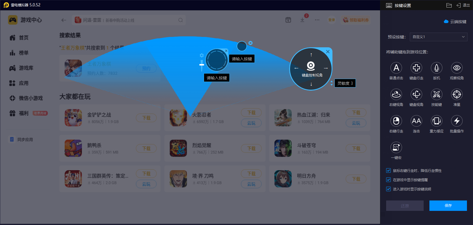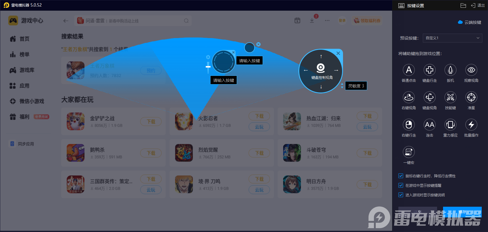 瑶曜炸盾流的核心在于快速调整英雄站位、精准分配资源,雷电模拟器的键鼠操作能完美规避手机触屏的误触问题。在备战阶段,鼠标拖拽英雄棋子可精准定位,确保东方曜处于既能承伤又能触发炸盾效果的最优站位,避免因触屏偏移导致核心C位暴露或护盾覆盖失效。同时,面对商店刷牌、装备分配等高频操作,键鼠的精准点击与拖拽效率远高于触屏,能快速锁定目标,防止因操作失误浪费备战时间,让阵容成型速度领先对手。