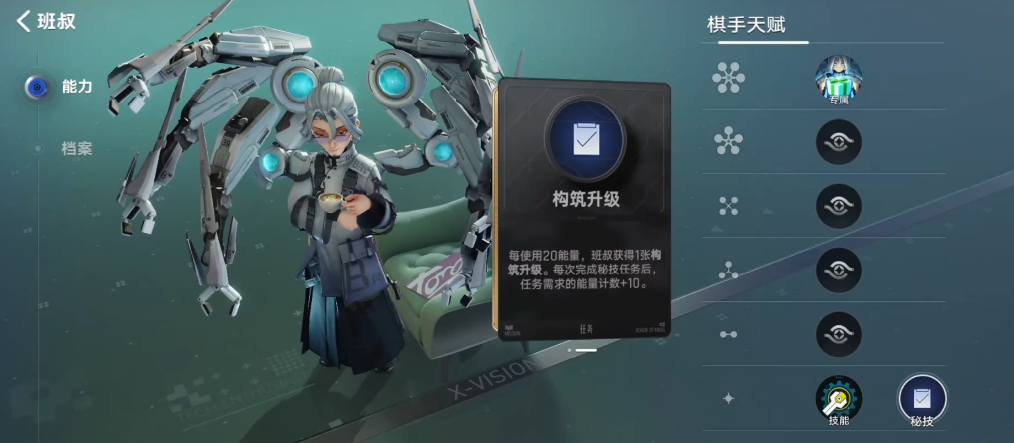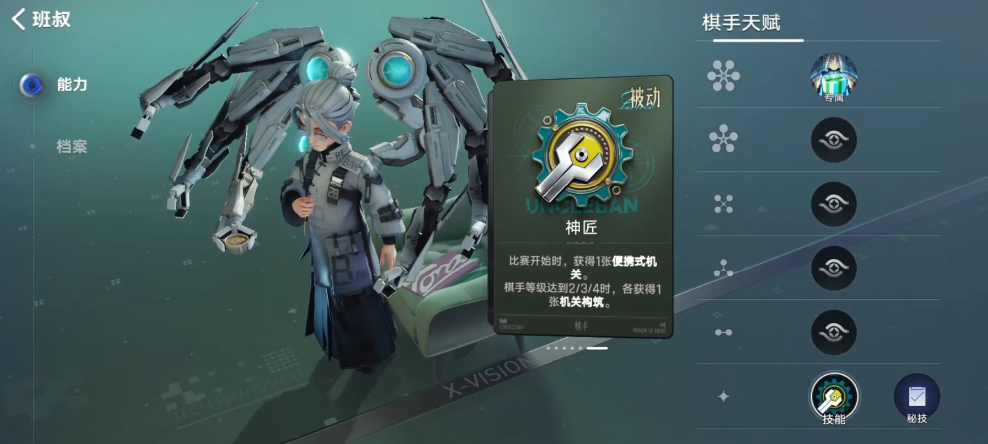 根据了解,他的核心技能是神匠,对局开始时,自动获得1张便携式机关卡,可部署于任意空置格位,为前期战局奠定基础,而且随着班叔自身等级,不同节点都会分别额外获得1张机关构筑卡,总计最多可获取3张基础构筑机会,从而不断去强化自身的机关铺场能力。