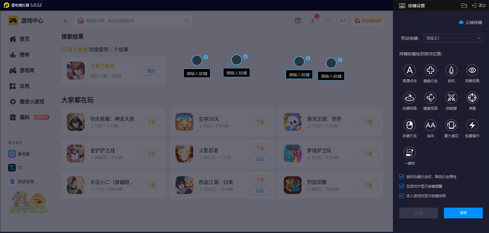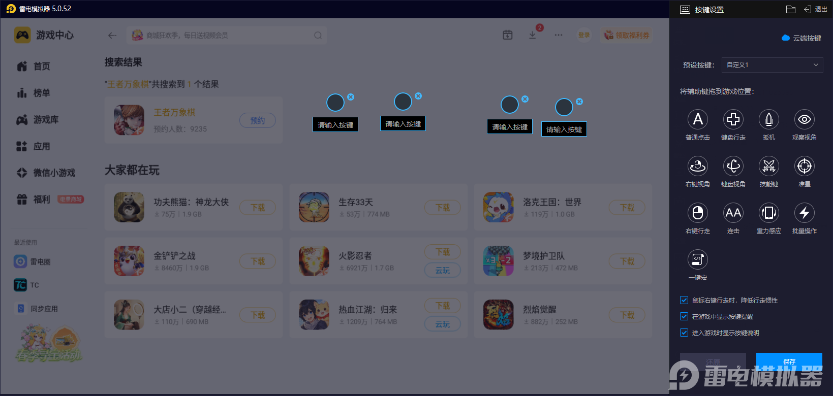 班叔的核心操作围绕机关部署、资源分配和站位调整展开,而雷电模拟器的运行则是能让玩家去自定义不同的键位,可把棋子选取、机关部署、装备分配等操作绑定到自己习惯的键盘快捷键,鼠标实现精准快速的点击。相比手机触屏,避免了误触和点击偏差,尤其在竞拍卡牌、调整棋子站位等关键节点,能一键到位,让班叔的策略布局快速落地,不会因操作失误影响运营节奏。