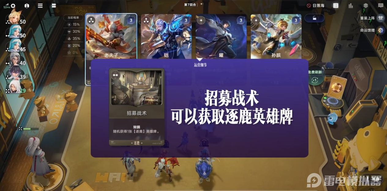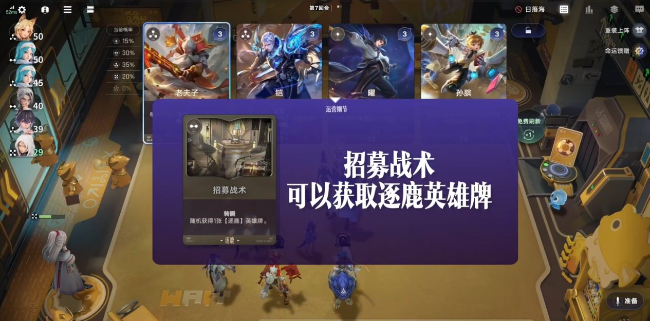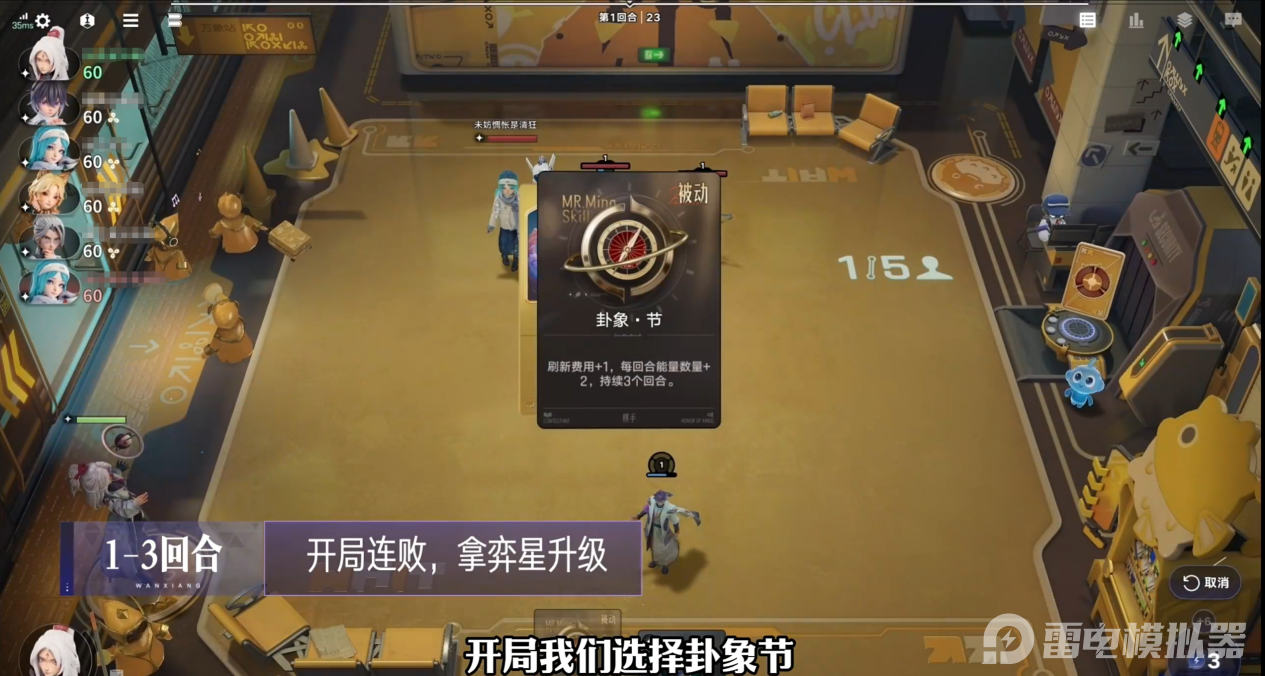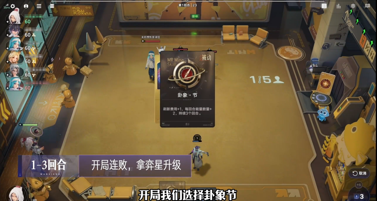 在1-3回合中,选择卦象“节”,先苟着积攒能量,拿弈星升级,拍卖会上选芈月、苍、米莱狄3张英雄牌。