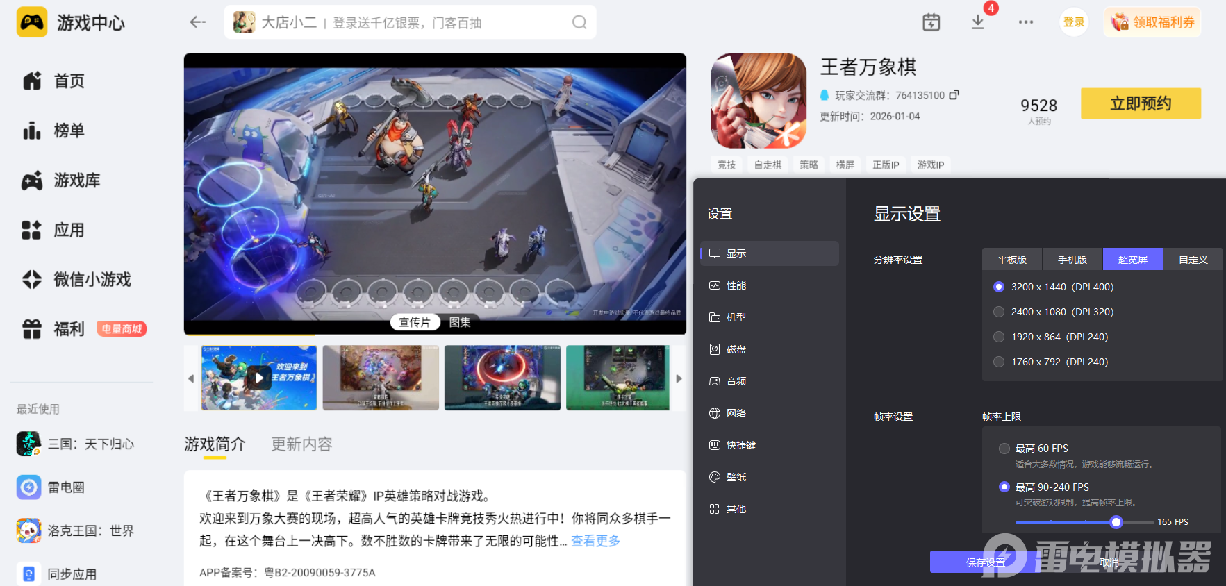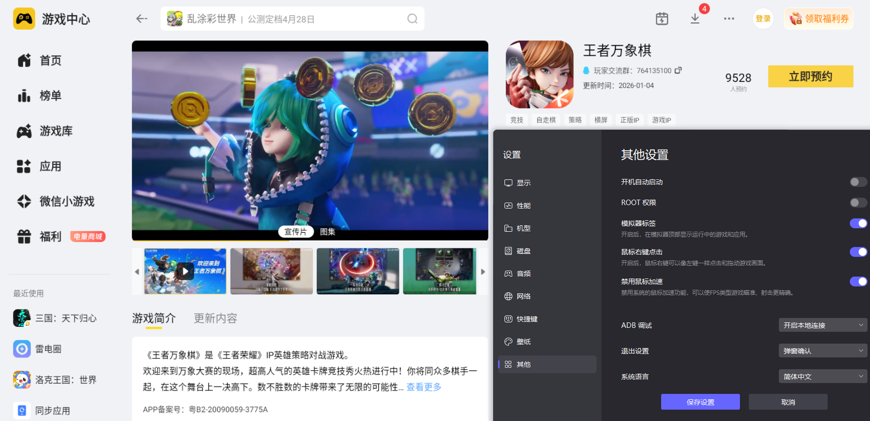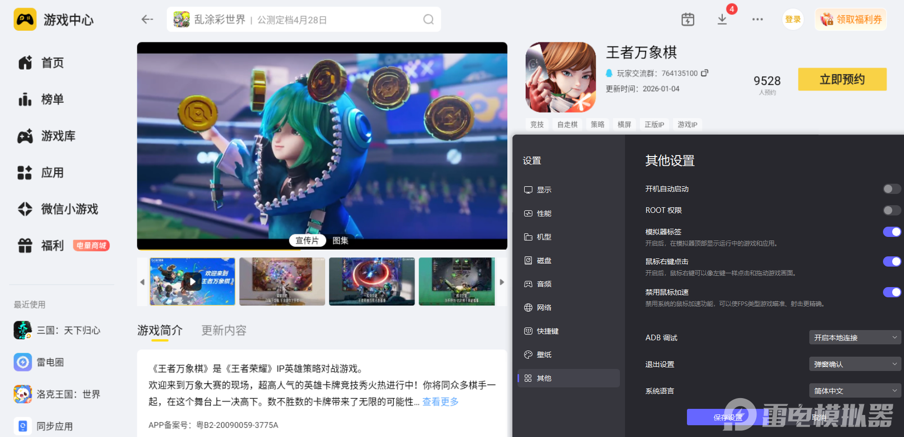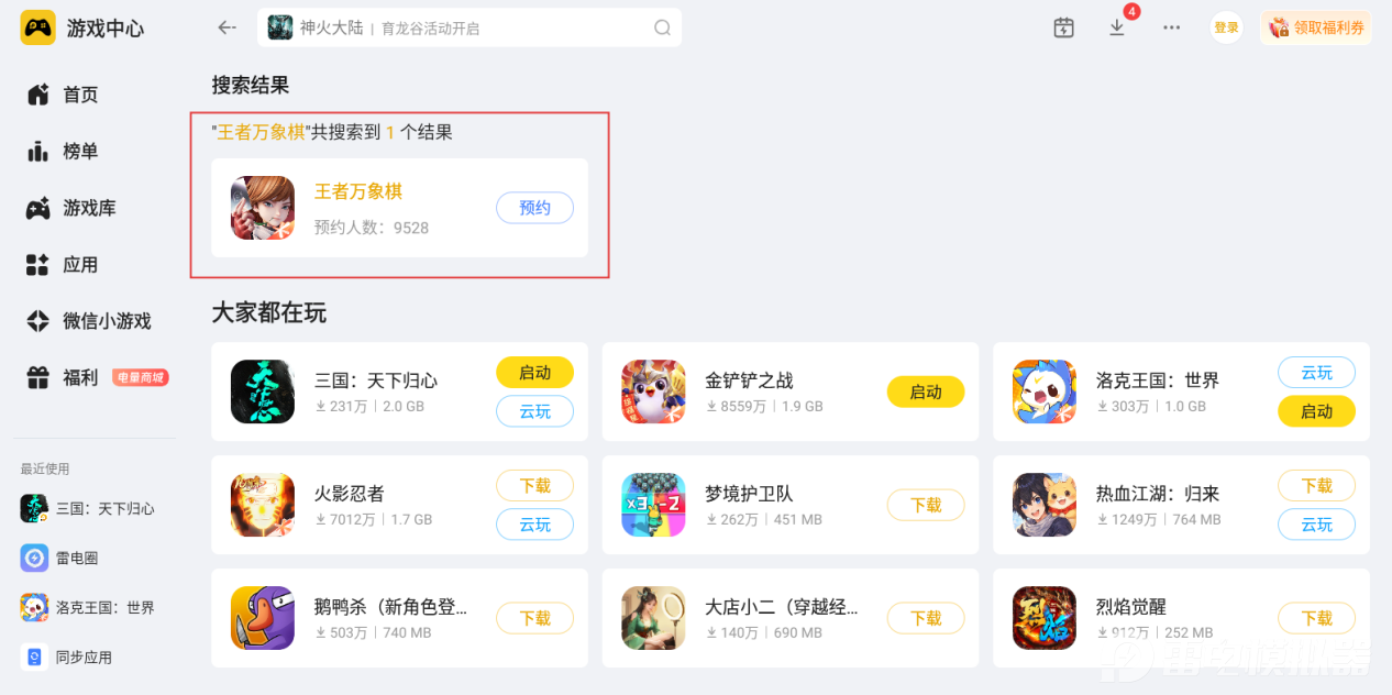 大家可以在雷电模拟器官网下载雷电模拟器,然后在内置的雷电游戏中心中搜索“王者万象棋”,点击预约,待游戏上线的时候就会自动帮大家下载,非常的方便。