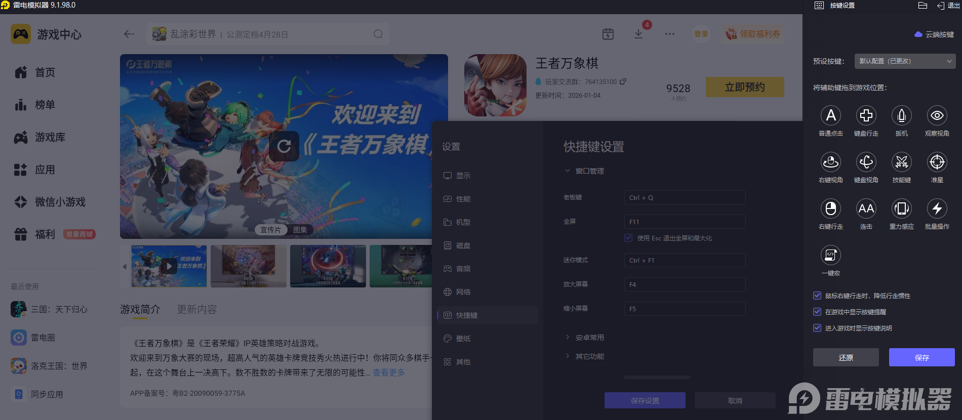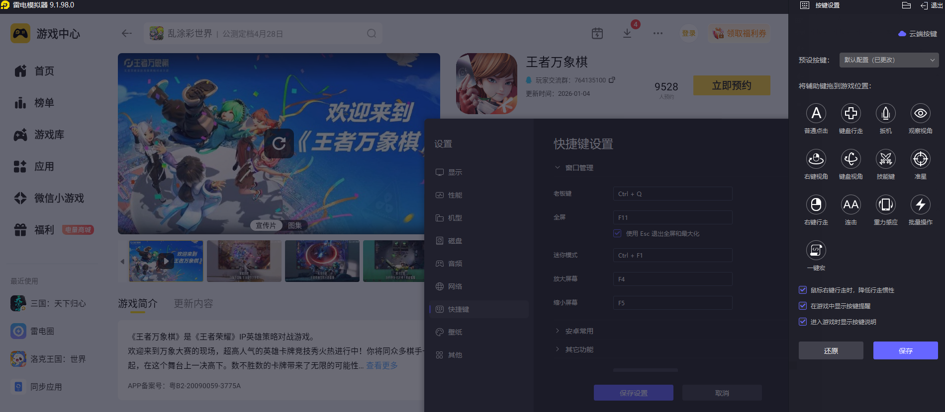 王者万象棋备战阶段需要频繁调整英雄站位、购买英雄卡牌和分配游戏装备,频繁的精细布置操作,在小尺寸手机屏幕上很容易出现操作偏差,影响阵容成型节奏。雷电模拟器搭配电脑键鼠专属操控设置,适配王者万象棋所有布阵和对战操作逻辑,按键自定义设置贴合操作习惯,调整阵容和部署英雄更加精准高效,轻松完成各类精细战术布置操作。