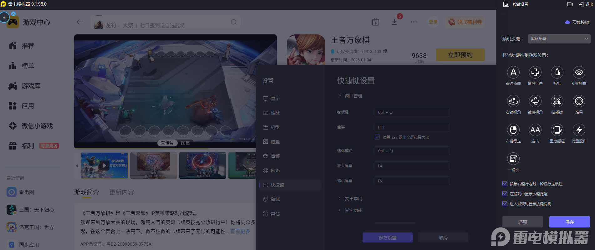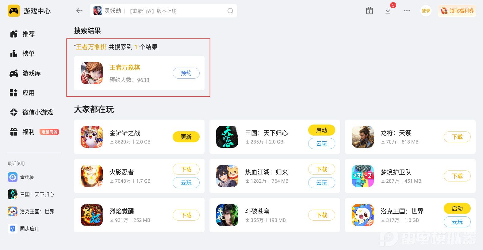 在这里,小编建议大家在电脑上借助雷电模拟器游玩王者万象棋,能收获比移动端更优质的游戏体验。无论是技能释放、卡牌选取还是阵容排布,操作都会变得更加便捷,整体对局运营的感受也会更顺畅,能全程专注规划技能使用与阵容搭建。