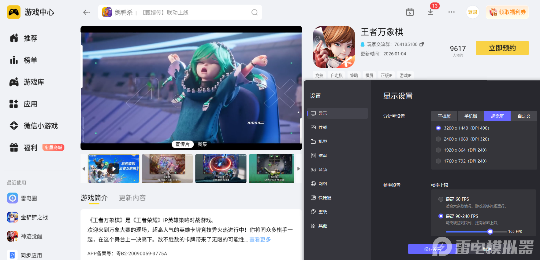 逐鹿培养核心流需要时刻观察核心棋子星级、战术牌触发状态以及羁绊加成效果,移动端的屏幕尺寸有限,容易错过关键养成时机。雷电模拟器采用4K分辨率+大屏高清显示模式,能完整呈现游戏内所有画面细节,核心棋子的养成进度、战场实时变化都能清晰查看,方便及时调整养成策略,牢牢把控对局节奏。