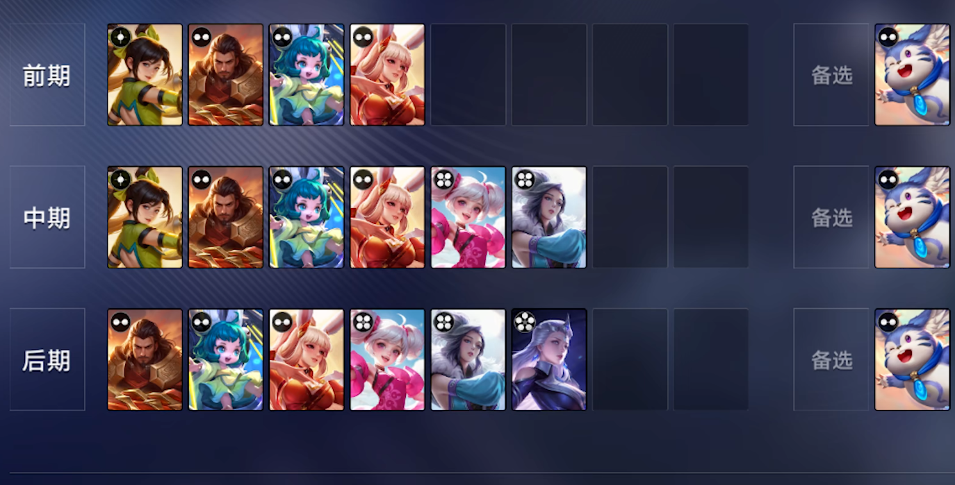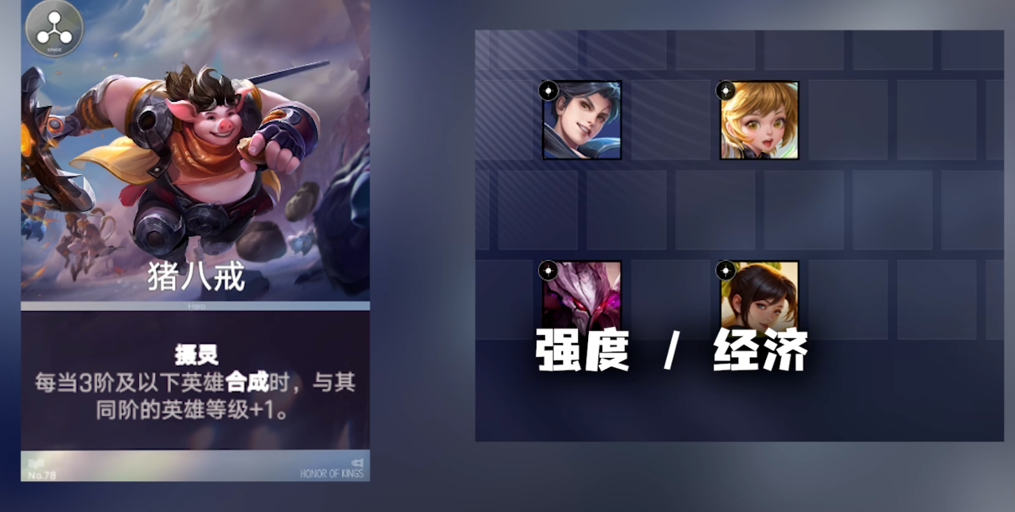 中后期可以开始升本,然后升级梦奇再次出售不但可以获得一次寻宝点数,还能获得一张一阶英雄进阶卡,可以找到孙尚香或者其他的一阶卡再出售,可以快速提升各位的实力,无论后期敌人怎么逆天都有一战之力,属于非常强的混分阵容,虽然吃鸡比较看运气,但是能够稳定上分就是非常强的组合,同时猪八戒孙兵等等角色也能提升阵容的整体强度,属于非常强力的推队组合。
