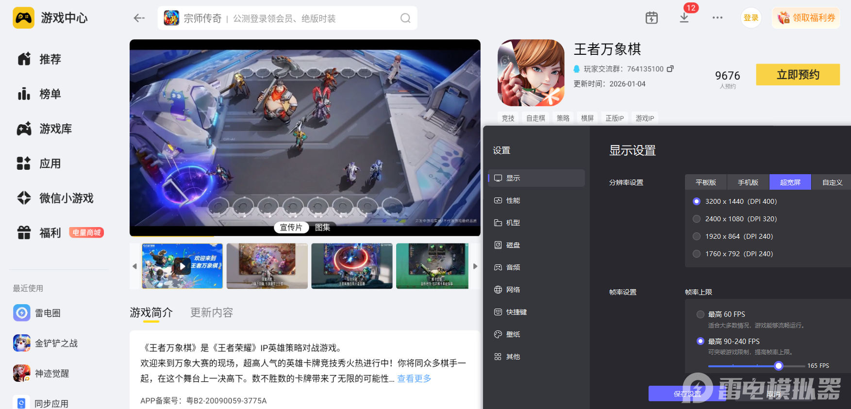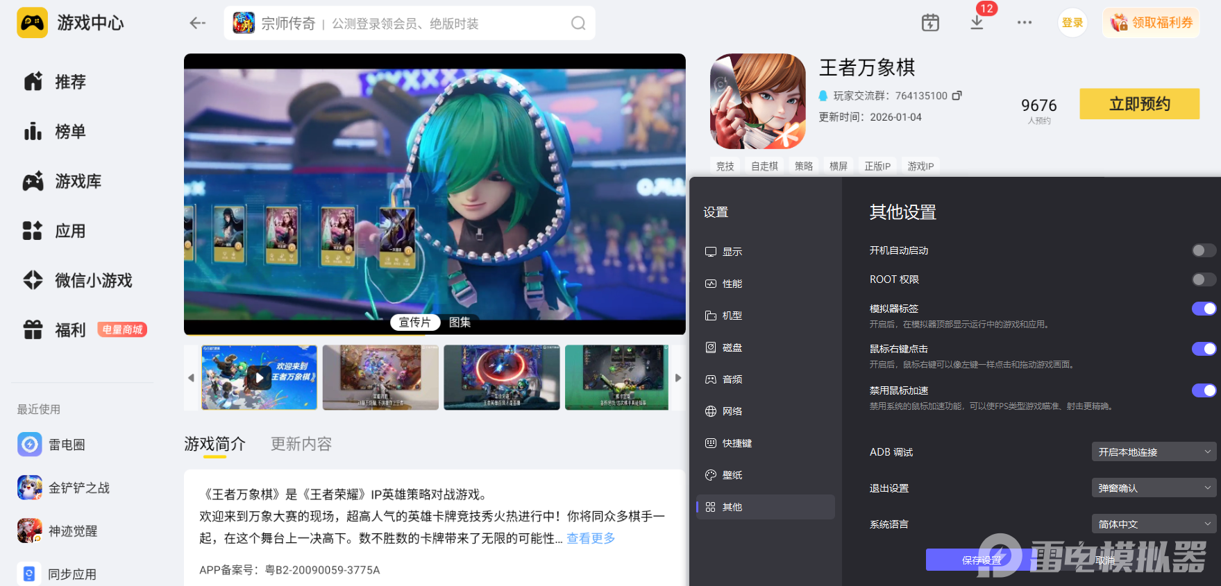 在这里,小编建议大家在电脑上使用雷电模拟器游玩王者万象棋,能让整体游戏体验变得更加舒适。相较于手机端,电脑端的游玩模式更适配策略对战的操作需求,不管是装备分配还是阵容调整,都能更顺畅地完成,让整局游戏的操作节奏更贴合策略玩法的核心需求。