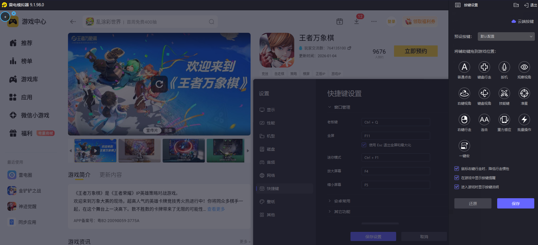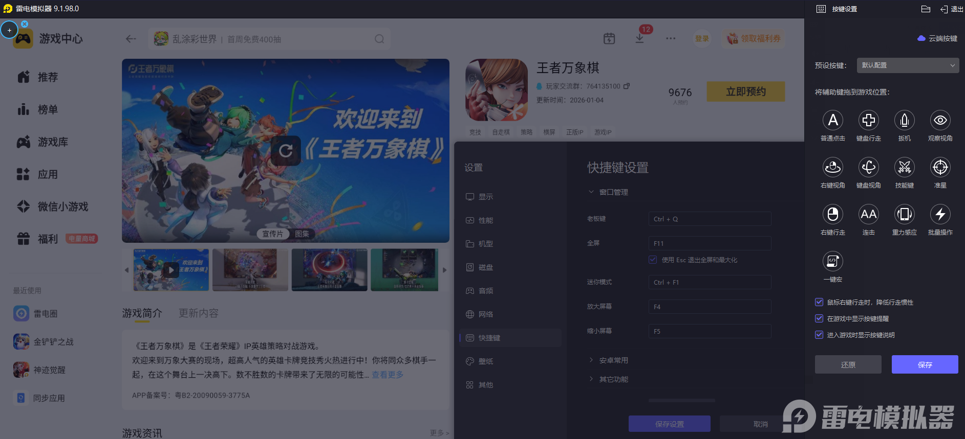 王者万象棋对局节奏偏快,需要快速为不同棋子完成装备选取、穿戴与替换操作。手机触屏操作容易出现点击偏差,还会拖慢整体操作速度,影响装备分配的效率。雷电模拟器适配专属键鼠操控模式,按键点击精准度极高,能快速完成各类装备相关操作,让装备搭配流程更高效,始终牢牢把控对局节奏。