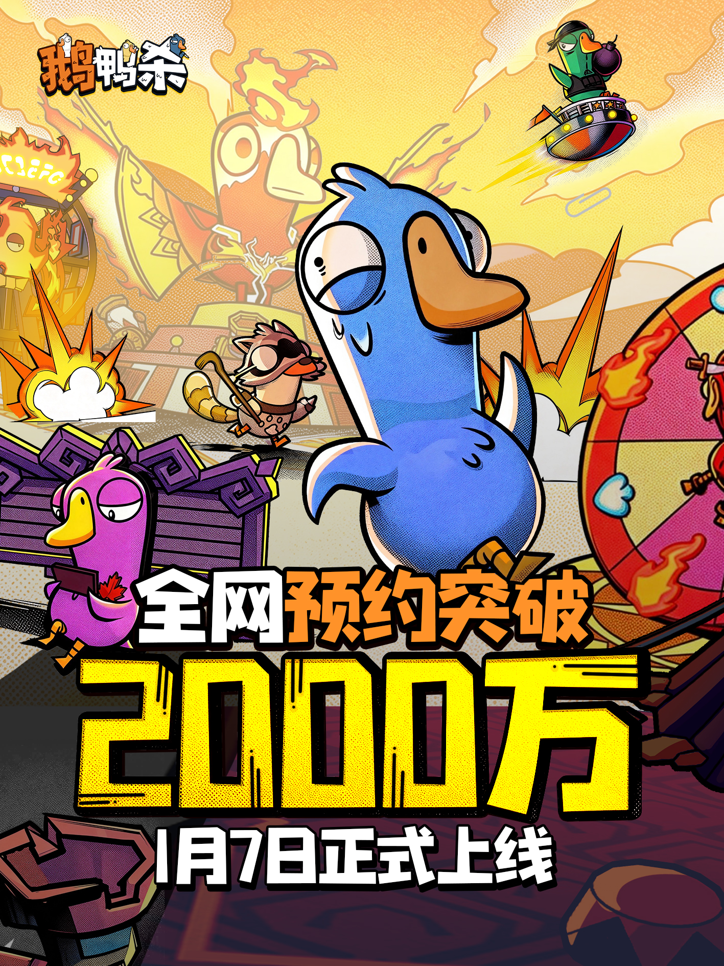 鹅鸭杀全网预约突破2000万!感谢各位幸运鹅的关注与支持!1.7日鹅鸭杀手游正式上线,幸运鹅们我们不见不散~