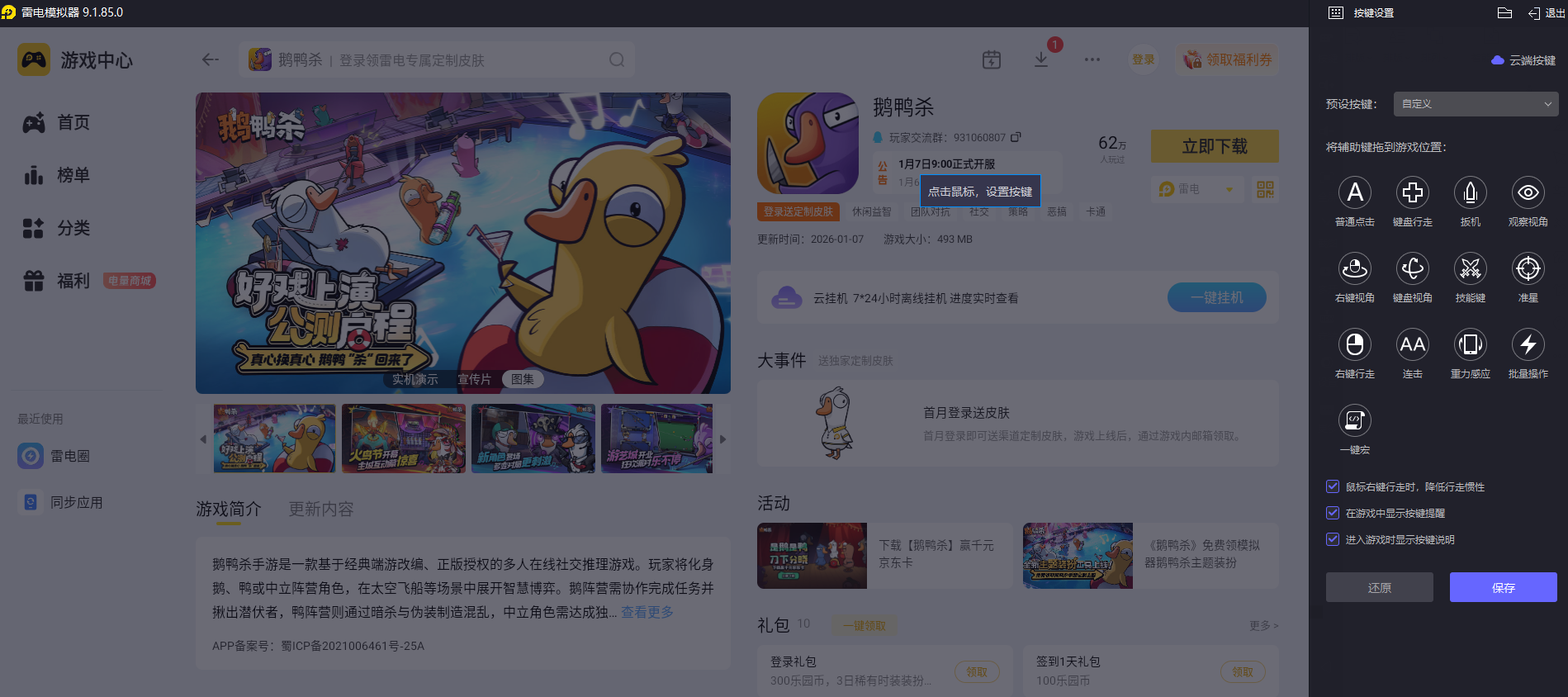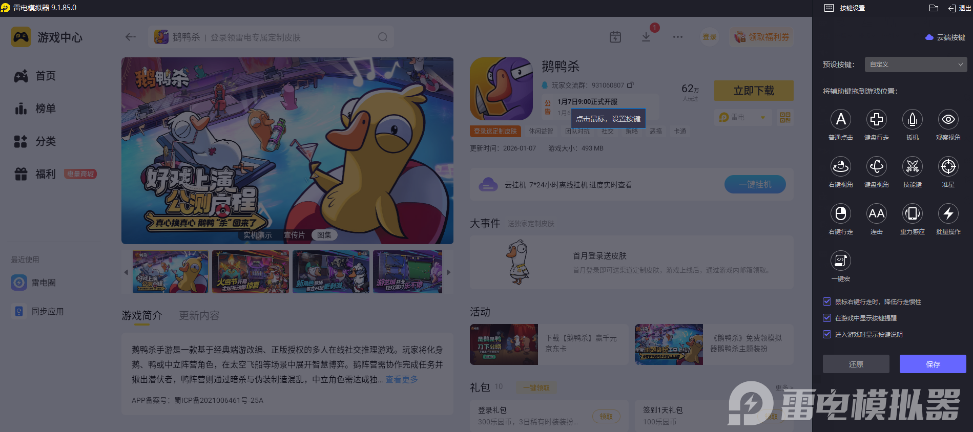 雷电模拟器对《鹅鸭杀》做了专属按键适配,有预设的操作方案,也能自定义宏命令。用键鼠操作比手机触屏更精准,移动、做任务、紧急跑路时反应更快,尤其是在被怀疑需要快速行动证明清白,或是鸭子阵营偷偷搞破坏时,灵活的操控能让你更从容应对,减少误操作带来的麻烦。