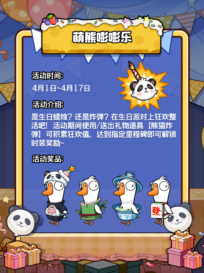 • 熊猫狂欢派对:使用熊猫炸弹累积狂欢值,解锁限定时装奖励