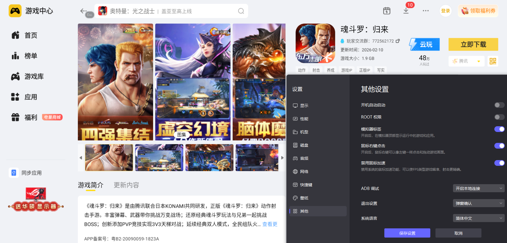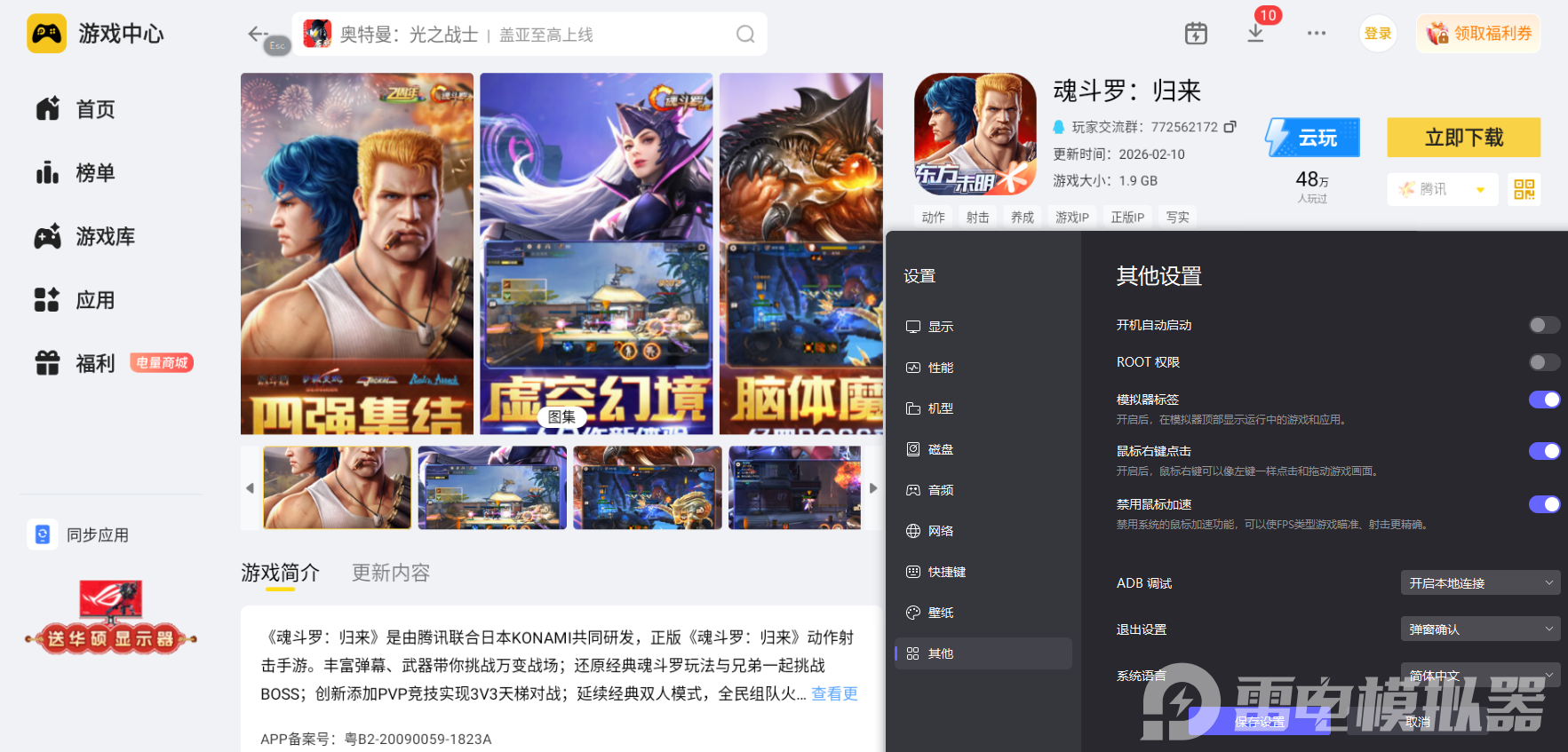 结合《魂斗罗归来》快节奏射击、多角色养成和组队副本的游戏特点,雷电云游戏能带来多重实用的游玩体验。每日每款游戏可以免费游玩三小时,让大家零成本畅享热血战斗。它自带安卓和iOS双端登录,账号数据可以自由互通。还支持边下边玩,后台将游戏下载至模拟器,完全不影响云游戏的体验。云游戏还能配合使用模拟器的按键自定义、操作录制和多开同步等工具,刷副本练角色都会更高效。