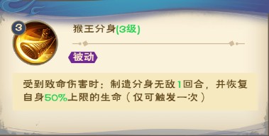 受到致命伤害时:制造分身无敌1回合,并恢复自身50%上限的生命(仅限一次)。