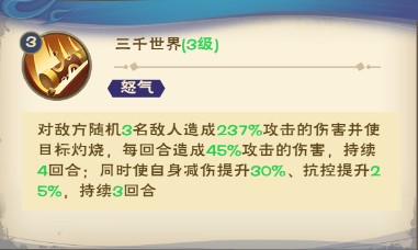 对敌方随机3名敌人造成237%的伤害并使目标灼烧,每回合造成45%攻击的伤害,持续4回合;同时使自身减伤提升30%、抗控提升25%,持续3回合。