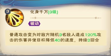 普通攻击变为对敌方随机2名敌人造成120%的伤害并使目标降低40的速度,持续2回合。