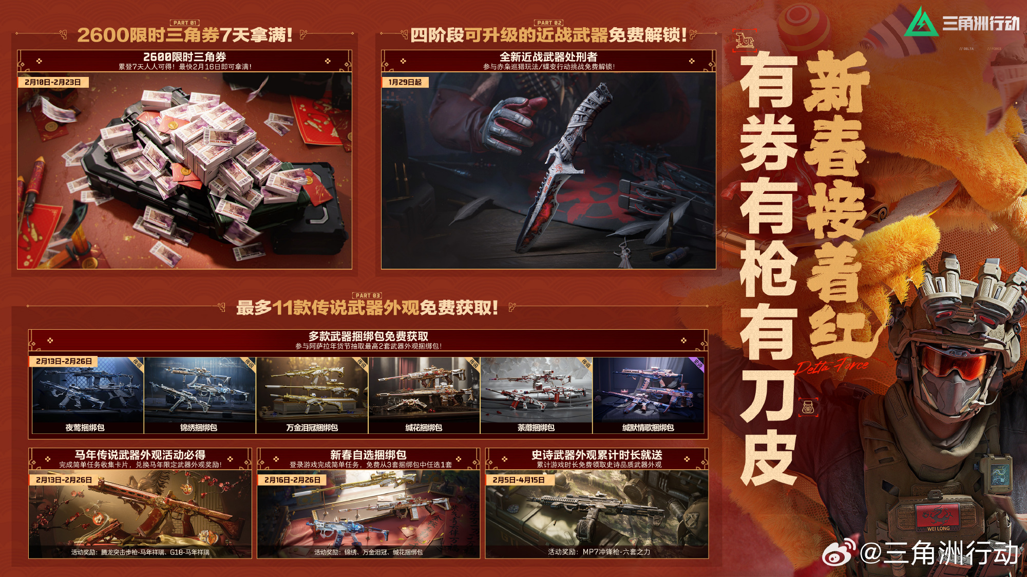 有券有枪有刀皮!更有刘涛送六套!《三角洲行动》新春福利全攻略!史无前例的新春福利大放送!2600限时三角券7天登录送、11款传说武器外观免费得、参与玩法免费拿传说近战武器!还有六套福袋、新春大红、百万哈夫币红包等海量物资道具等你领取!