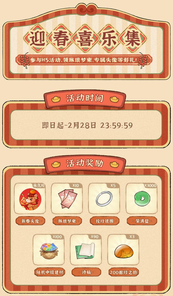 参与H5活动,可兑换获取马年限定游戏头像、最高可免费领取【琳琅梦柬X10】、【投珍银圈X5】、【荣满璧X3000】哦!