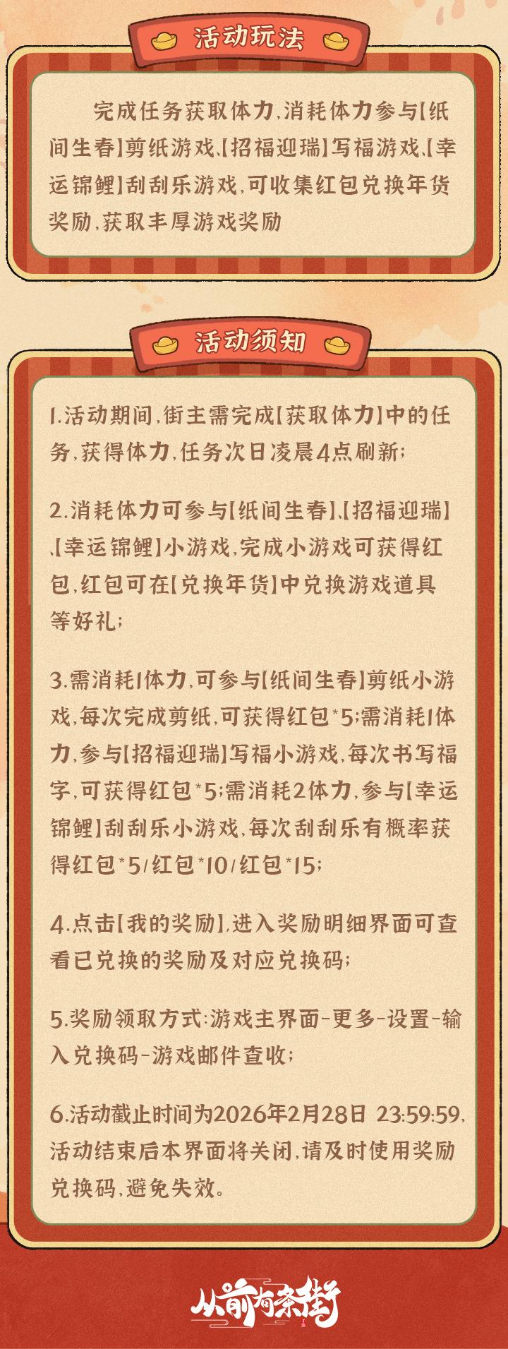 通过参与[纸间生春]、[招福迎瑞]、[幸运锦鲤]获取红包,消耗红包可在兑换年货天描年货铺中兑换奖励。马年限定游戏头像、琳琅梦柬、投珍银圈等奖励等你领取!