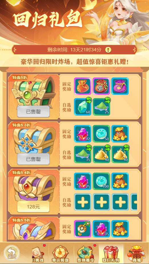 1.特惠礼包含固定奖励和自选奖励