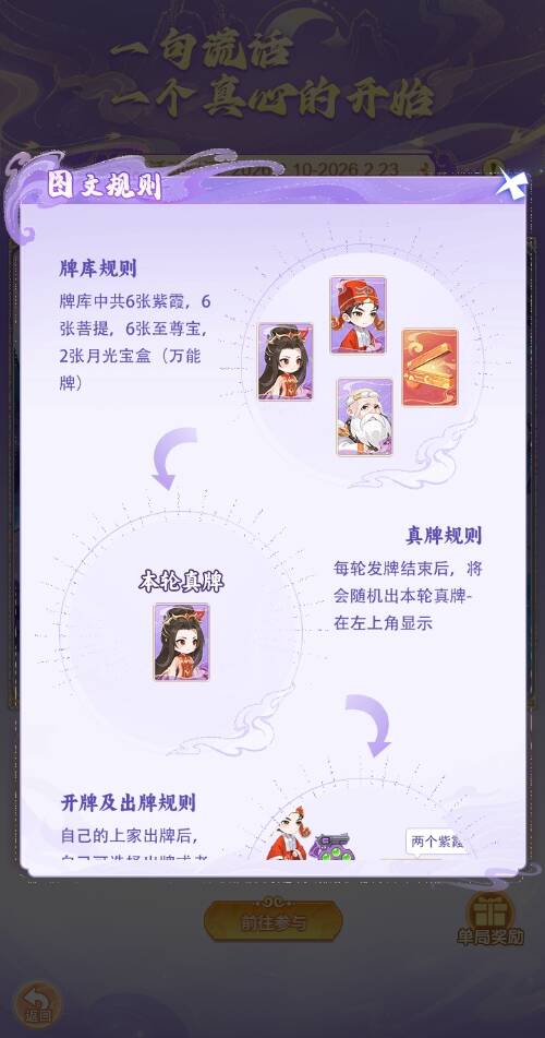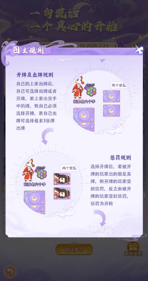 2.每轮有规定要出的主牌(至尊宝、紫霞、菩提祖师中的一种),玩家轮流出牌并声称自己打出了真牌,可以吹牛撒谎。如果下家不信就开牌,揭穿成功则惩罚上家,反之惩罚开牌者