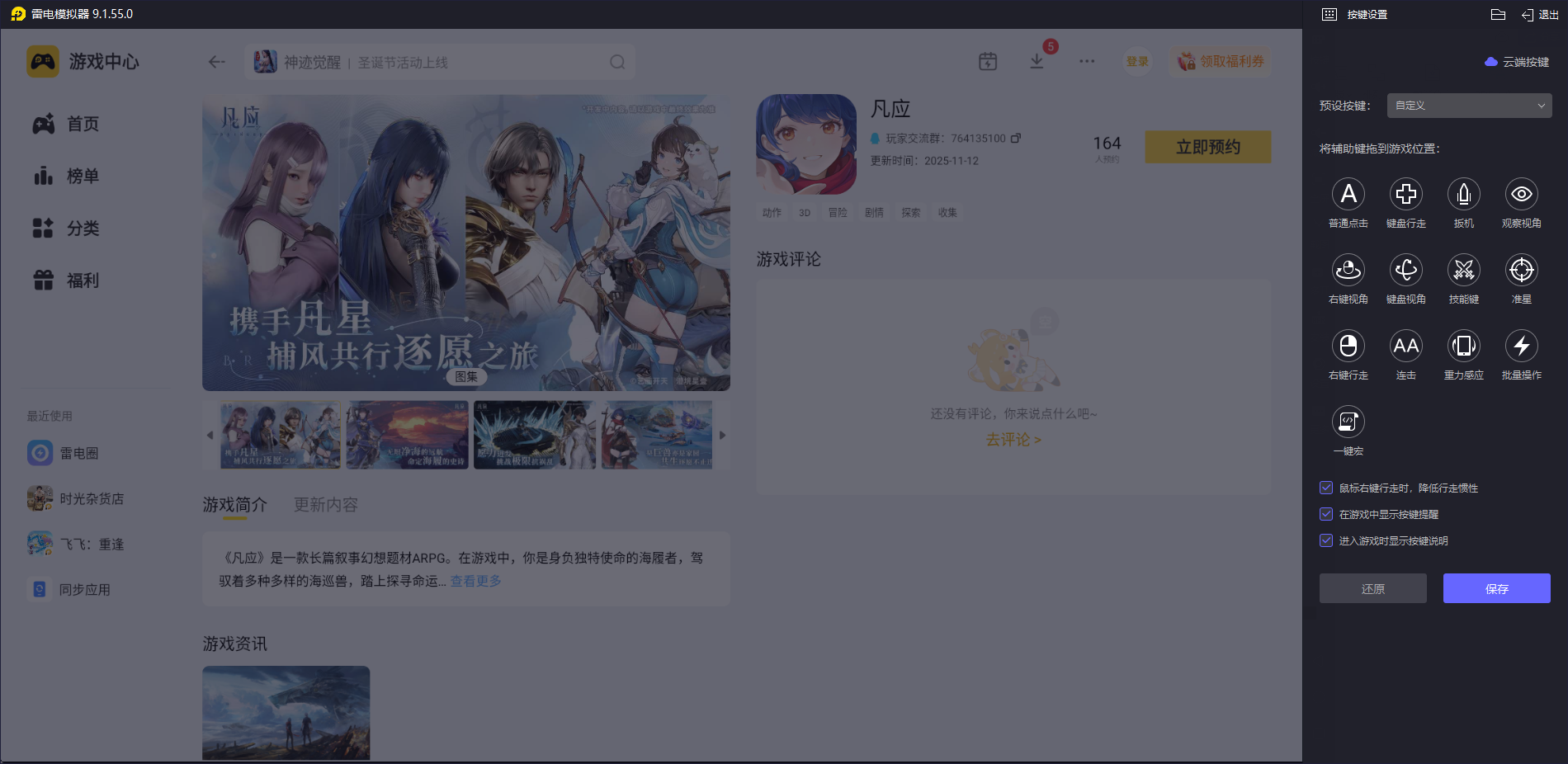 《凡应》的冒险充满未知与纷争,马克西姆的充能管理和走位调整需要精准操作,雷电模拟器刚好满足需求。玩家可自定义键鼠按键,将常用功能设置在顺手位置,避免触屏误触。键鼠操作响应迅速,能让你在应对突发危险时,及时调整马克西姆的站位、把控充能节奏,无论是前排抗伤还是配合队友推进,都能从容应对,在寻找“凡应”的道路上更顺畅地前行。