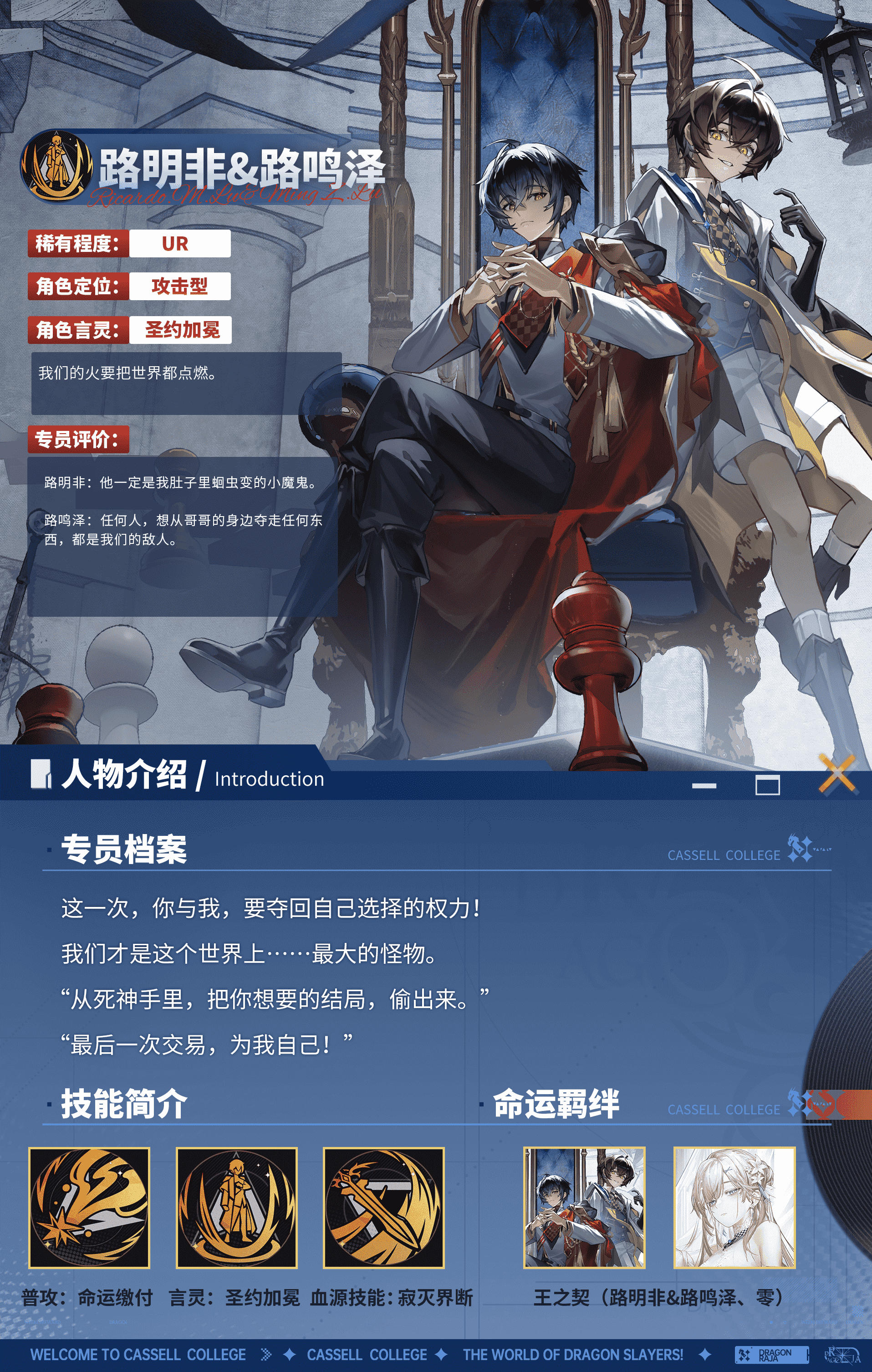 全新限定UR双生伙伴路明非&路鸣泽即将于2月11日正式上线!※ 路明非&路鸣泽每周有一次变更元素属性的机会,首次获得时自动设定为当前元素属性最高的属性(不占用切换次数)。“征途的时刻已至。”“我来为哥哥保驾护航。”更多技能信息请见下图。
