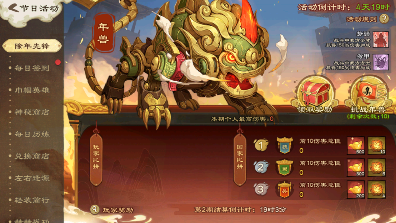 每期可挑战年兽10次,按伤害排名