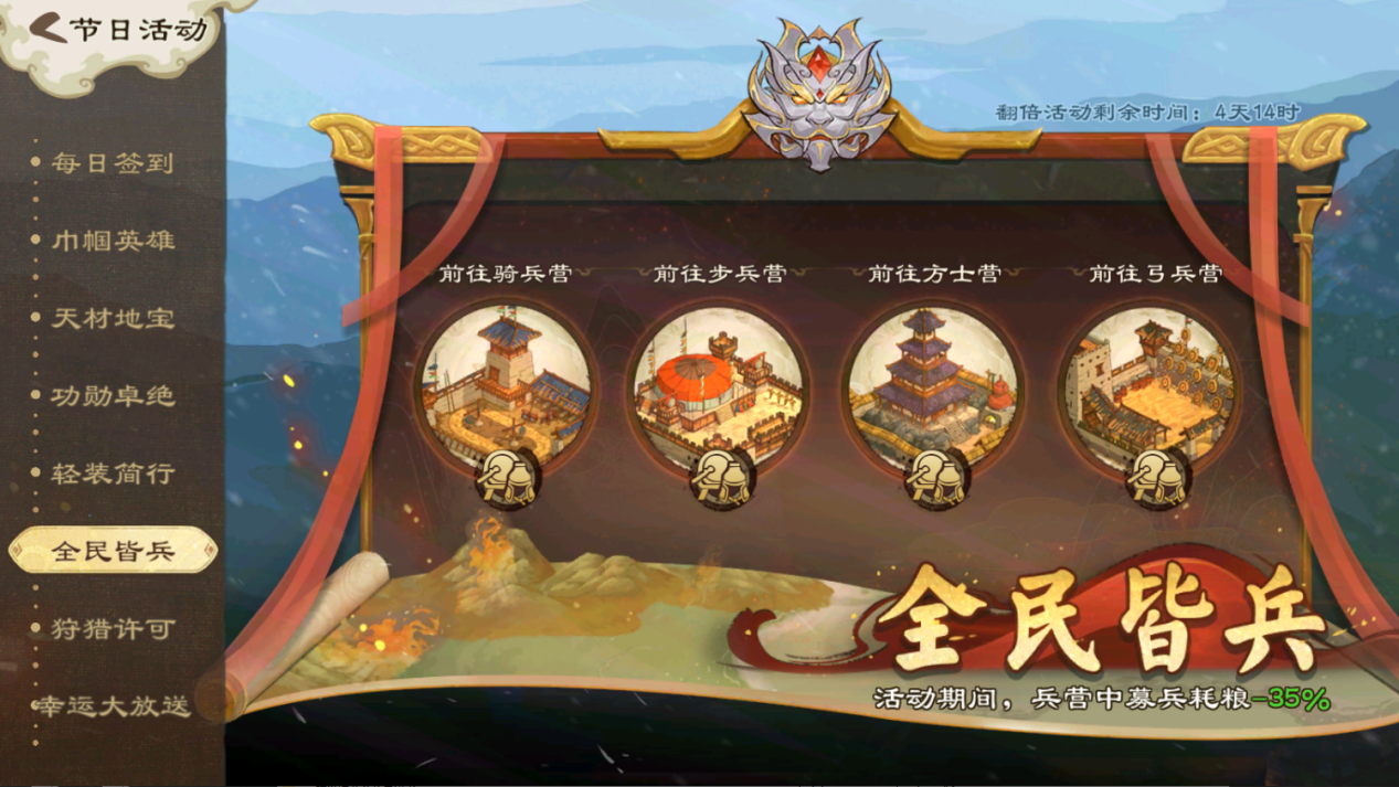 活动期间,兵营中募兵可减少粮耗