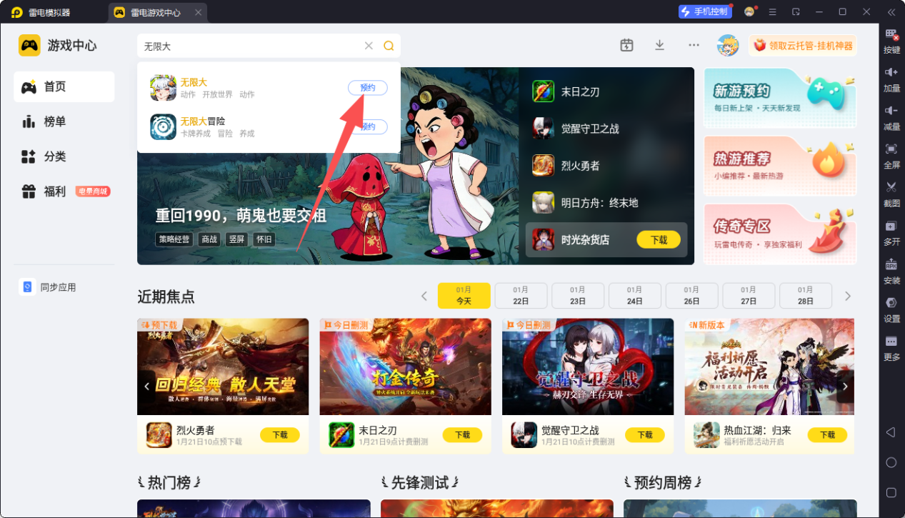 安装雷电模拟器后,打开主界面“游戏中心”,在搜索栏输入“无限大”。目前无限大依旧处于预约阶段,点击“预约”按钮即可接收上线通知。