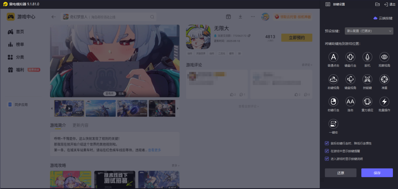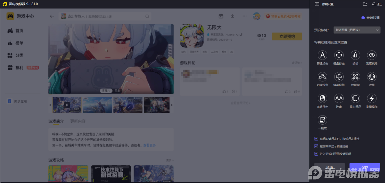 针对无限大中各种复杂的技能组合,雷电模拟器提供三层键位优化方案,例如基础层将梅卡尼卡的机械召唤映射到侧边键,进阶层通过宏指令实现"无人机侦察+电磁炮齐射"的连招自动化,终极层则支持手柄摇杆精准控制机器人移动轨迹。在模拟器预设的无限大专属键位方案中,玩家仅需滑动鼠标滚轮即可切换不同功能的机器人编队,这种操作逻辑与手机端形成降维打击。